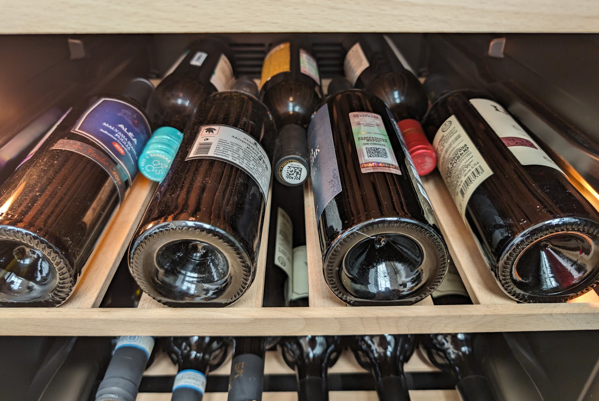 Чтобы оценить возможности этой модели, мы равномерно загрузили ее балластом в виде 15 бутылок вина, разместили внутри камеры пять температурных датчиков (по одному на полку) и включили устройство на максимальное охлаждение (режим «Sparkling» для игристых вин).