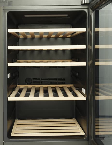 Шкаф рассчитан, разумеется, на горизонтальное хранение бутылок. Их можно разместить на четырех полках из некрашеного букового дерева: на древесине не скапливается конденсат, который может повредить этикетки и испортить пробки.