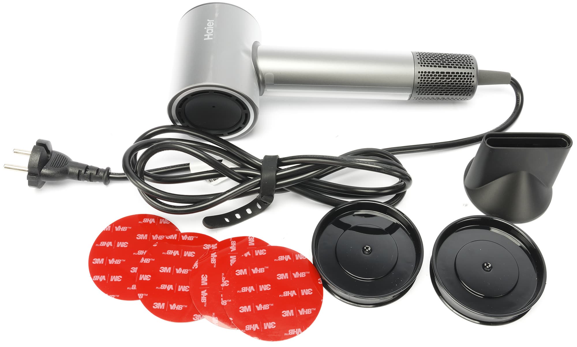 Комплект состоит из: самого фена, концентратора, пары магнитных креплений на стену, четырех самоклеящихся стикеров и инструкции.