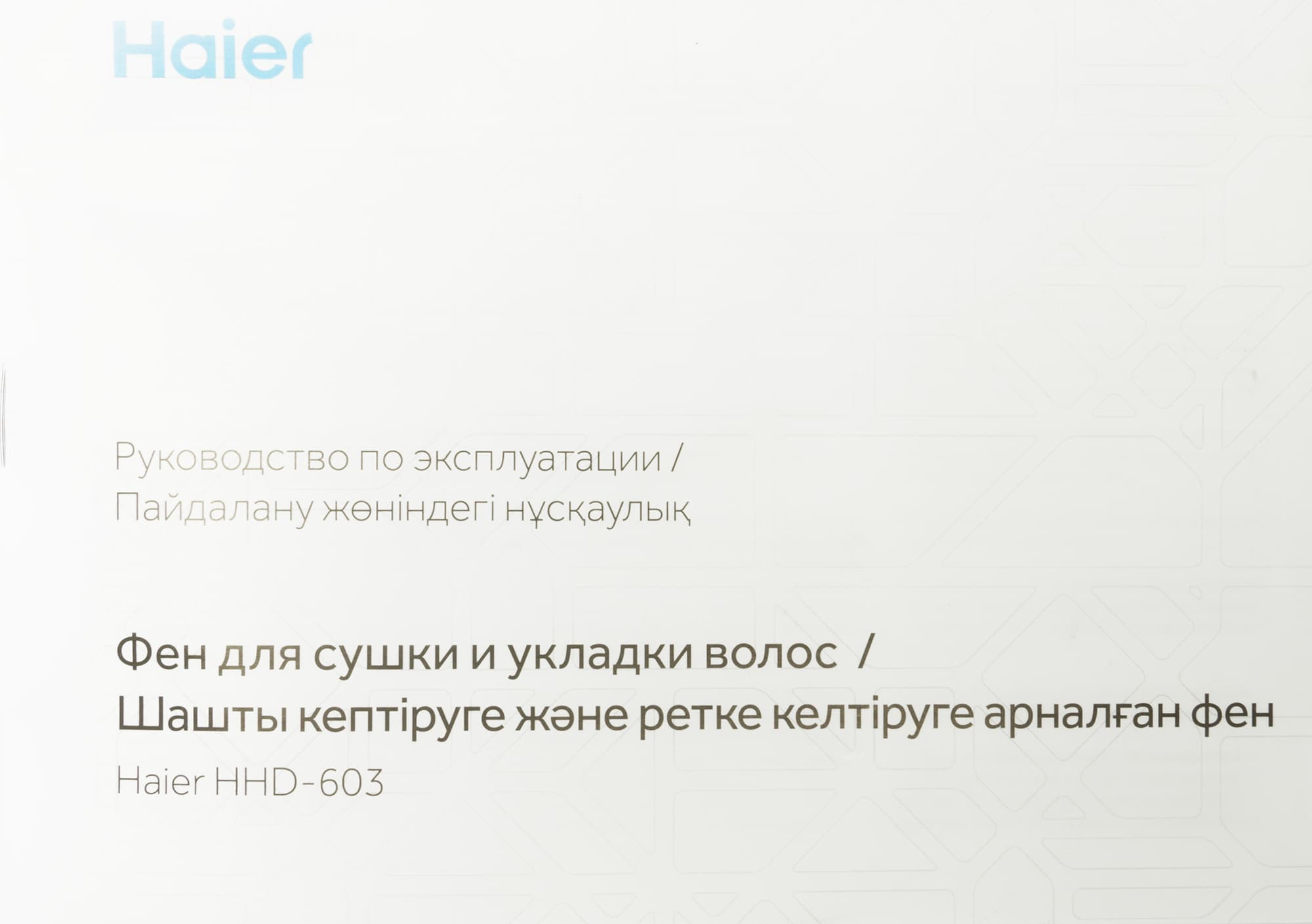 Haier HHD-603 поставляется в симпатичной небольшой коробке из прочного толстого картона с качественной цветной полиграфией. На лицевой стороне размещена фотография фена, рядом с ней — логотип бренда, уровень мощности и пиктограммы с обозначением главных особенностей модели. С обратной стороны — краткая техническая информация и данные о производителе.