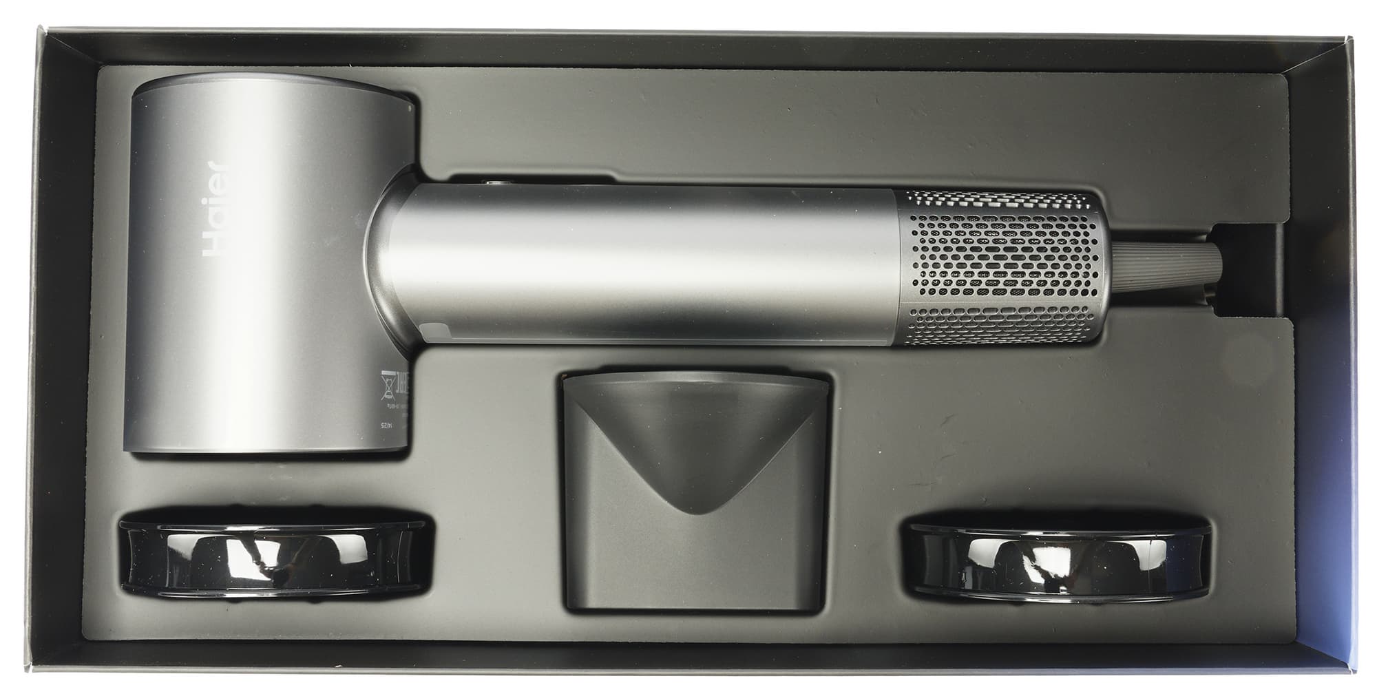 Внутри фен и аксессуары плотно уложены в ячейки пластиковой вставки.