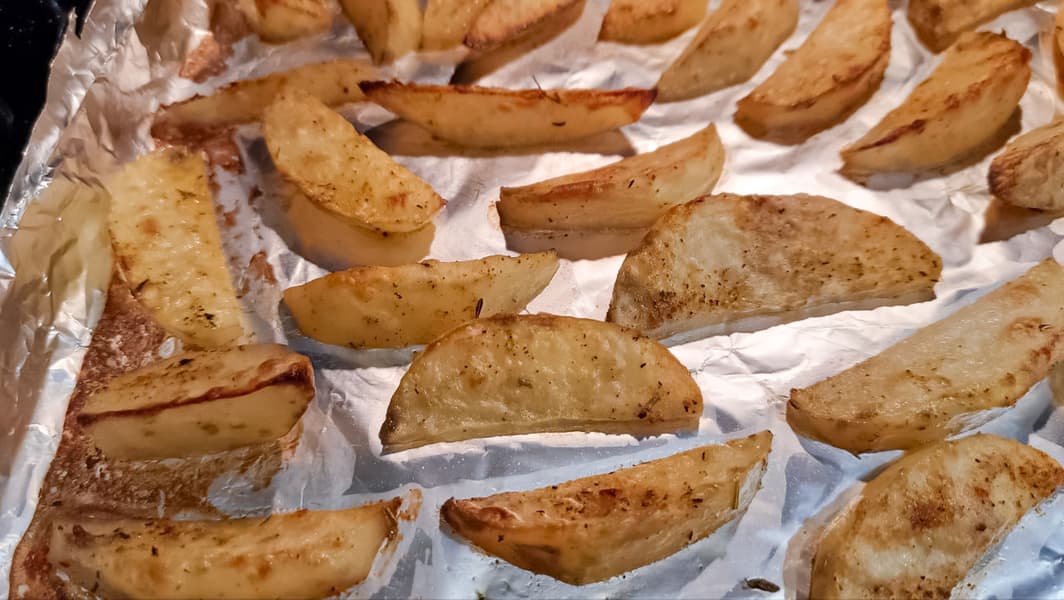 Дольки сырого картофеля, обмазанные солью и специями с небольшим количеством масла, поджаривались в режиме Аэрогриль при температуре 200 °C ровно 20 минут.