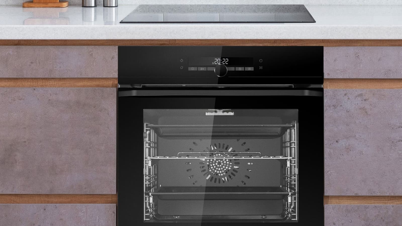Фасад духовки в современном минималистичном дизайне изготовлен из глянцевого стекла, смотровое окошко — прозрачное, сенсорные кнопки обозначены белым цветом, а некоторые части панели управления выделены темно-серым. Дисплей имеет приглушенное зеркальное покрытие.