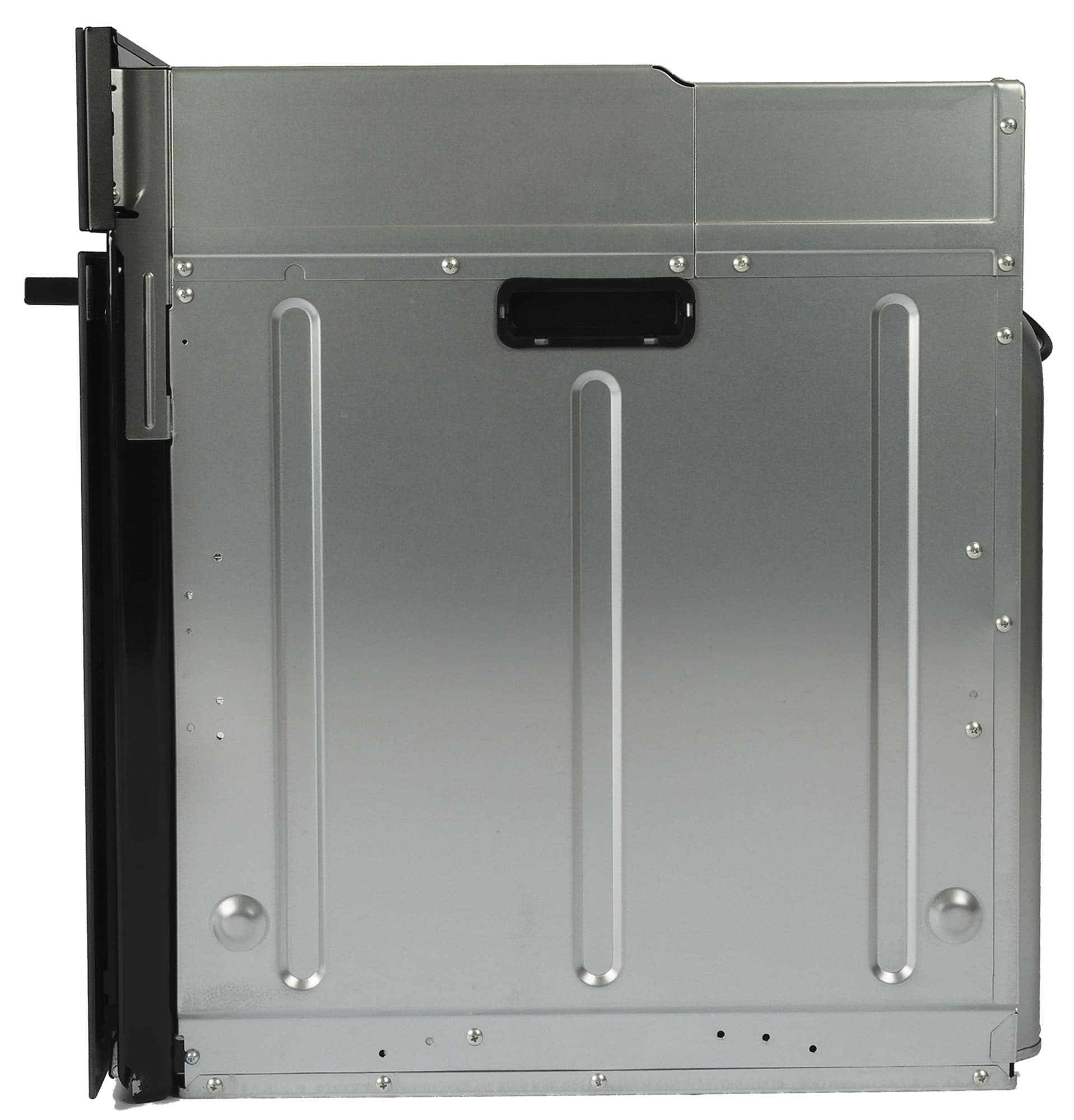 На внешних боковых стенках духовки выштамповки и ручки в виде углублений с пластиковыми вставками для удобства переноски.