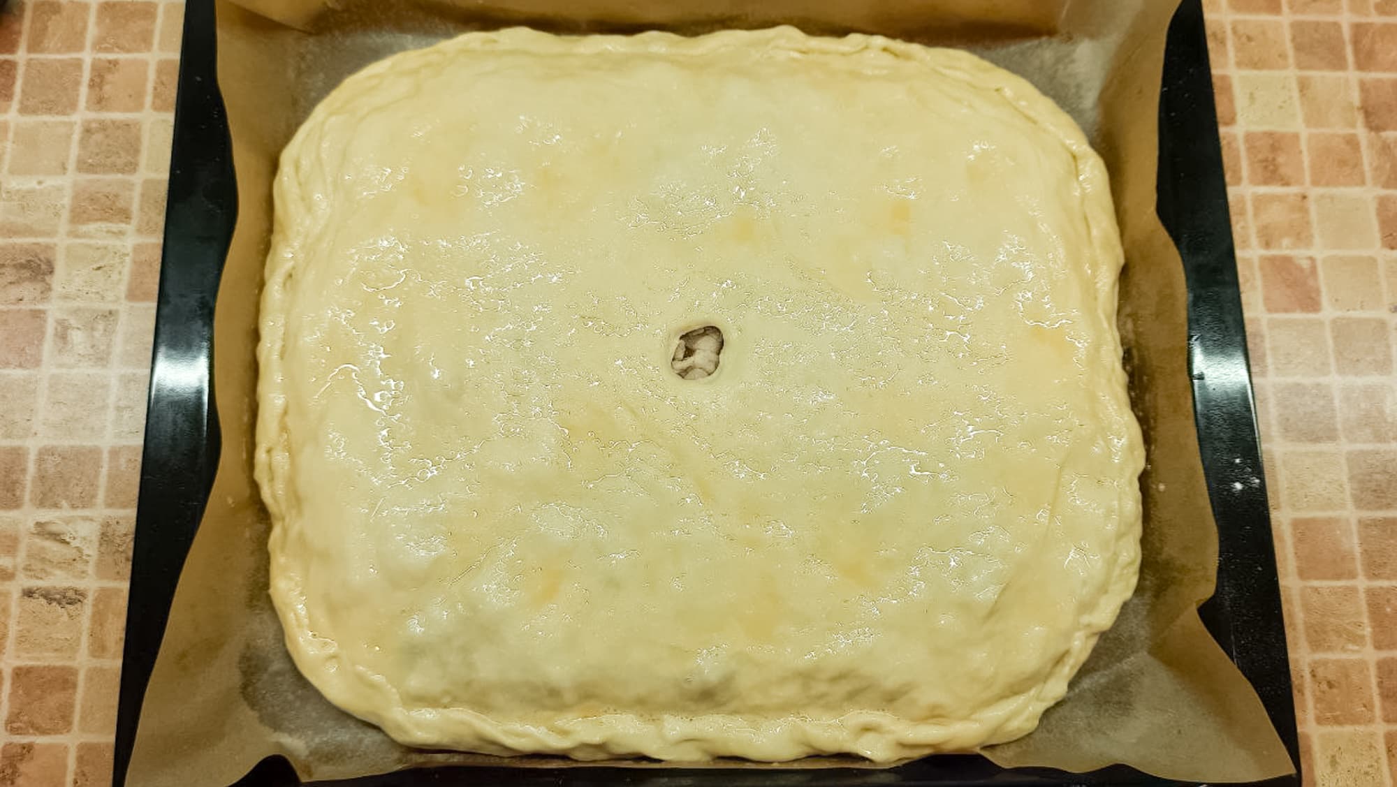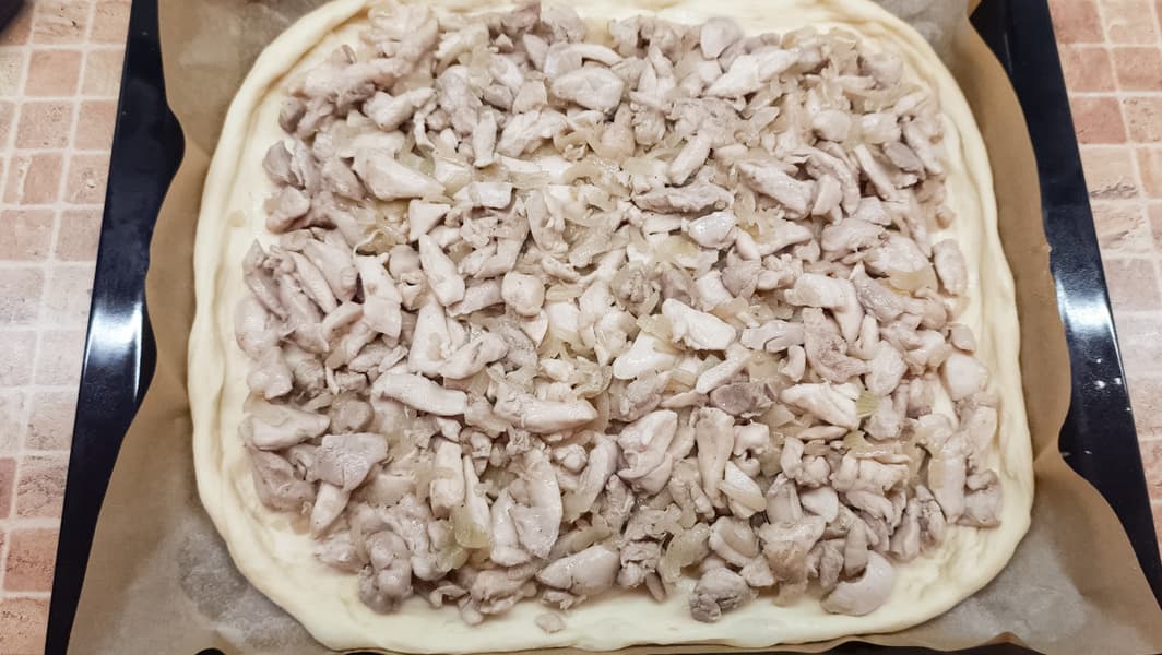 Первую часть теста растянули руками на весь противень, уложили начинку из заранее поджаренных куриных бедрышек с луком. Второй частью теста, также растянутой вручную, накрыли будущий пирог и защипнули по краям. Обильно смазали яйцом, а посередине сделали отверстие для выхода пара.
