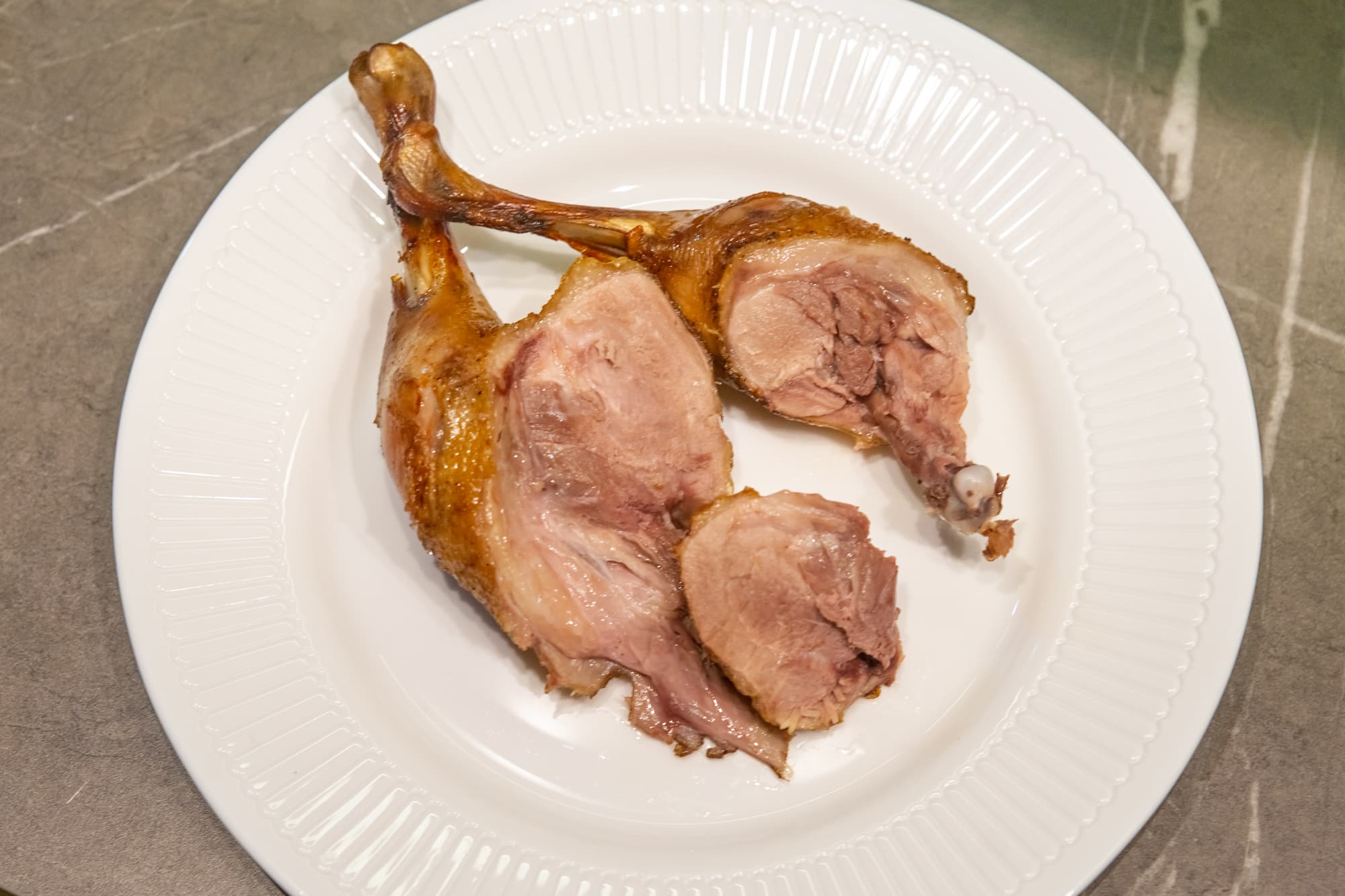 Утка хорошо пропеклась, сырых участков не осталось. Мясо сочное, корочка умеренно поджарилась.