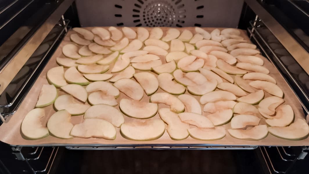 Режим сушки мы решили проверить на яблоках. Нарезали их тонкими дольками, уложили на решетку, застеленную бумагой, и поместили в камеру, нагретую до 70 °C.
