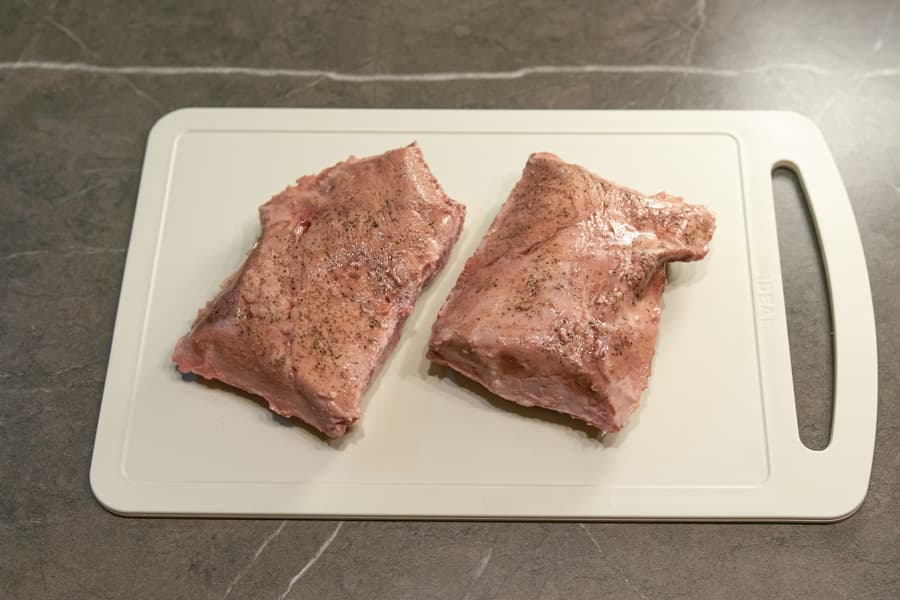 Свиную вырезку поделили на 4 части, натерли солью с черным молотым перцем и вакуумировали в 3 пакета.