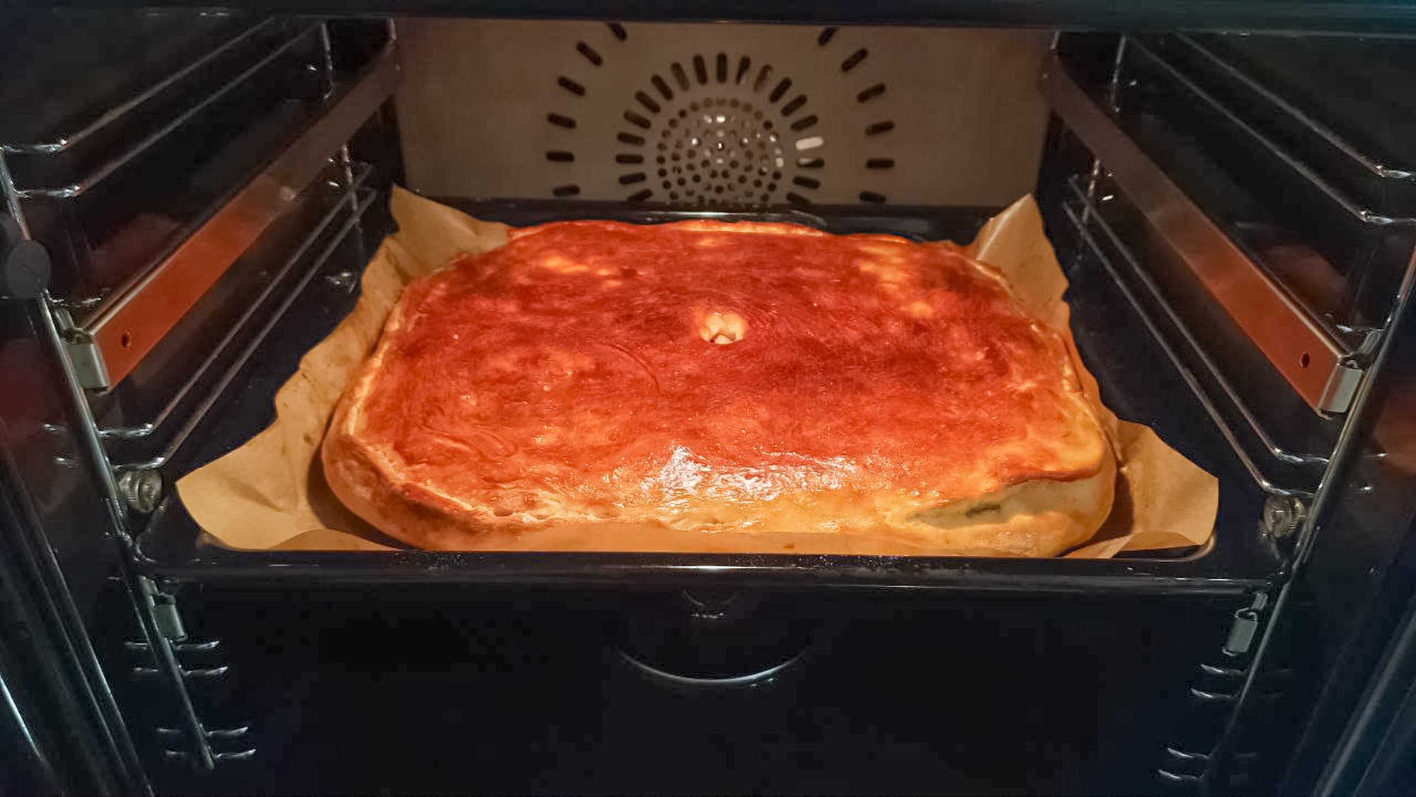 Через 25 минут пирог уже заметно зарумянился. Включили подачу пара еще два раза подряд, а когда верхушка полностью зарумянилась, сменили режим на нагрев снизу и через 10 минут выключили духовку.