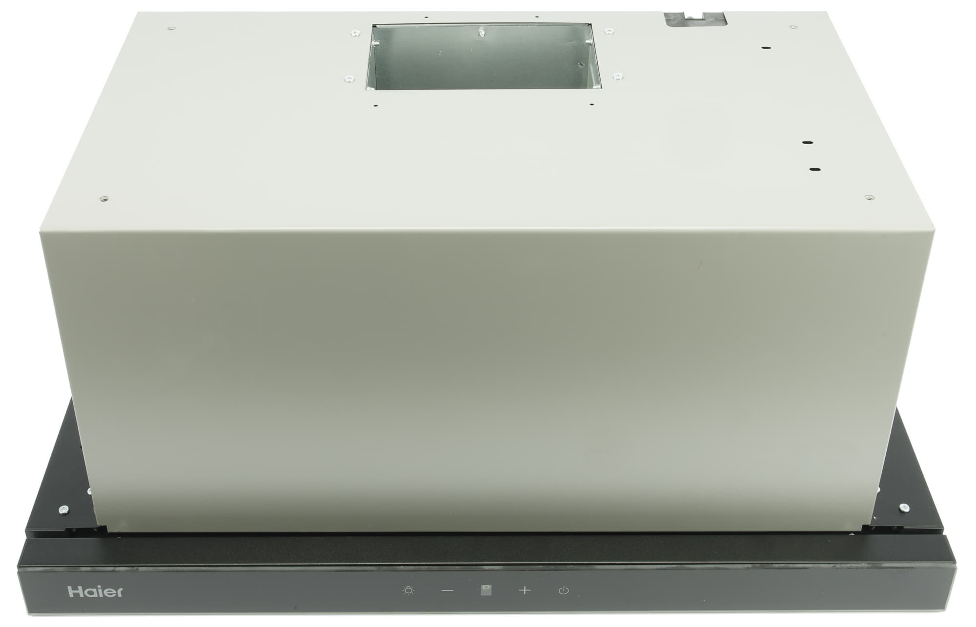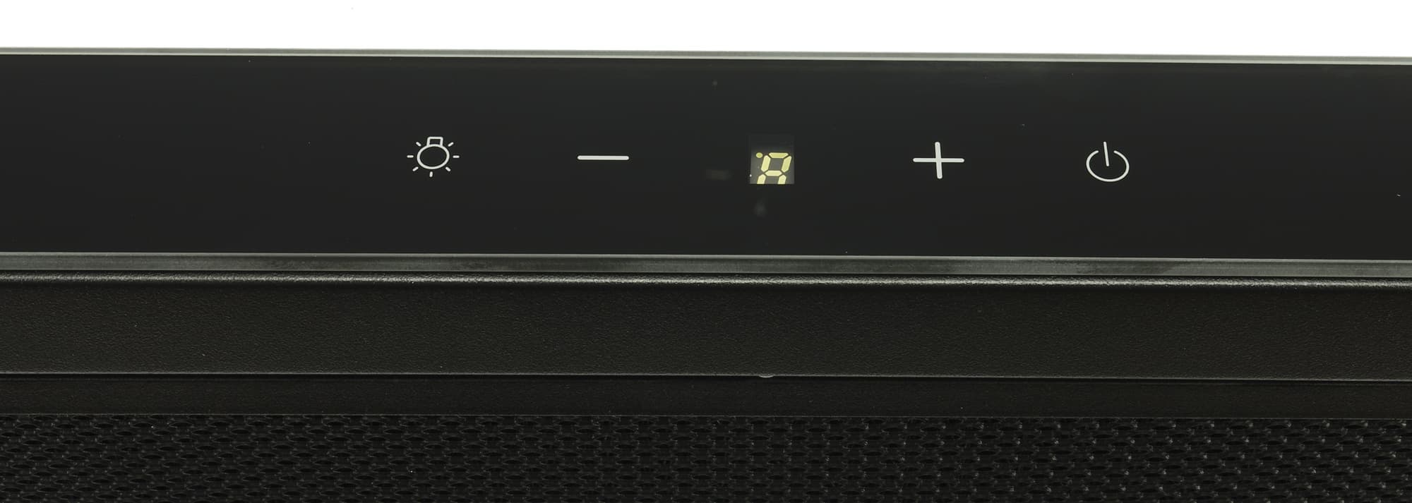 На фронтальной (выдвижной) панели вытяжки мы видим логотип производителя, а также набор сенсорных кнопок и цифровой светодиодный индикатор.