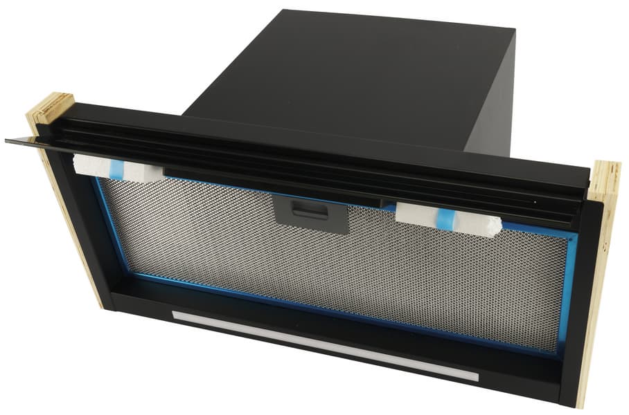 После распаковки перед нами предстало вполне классическое решение — вытяжка, допускающая как настенный монтаж, так и монтаж внутри шкафа. Что касается дизайна, то тут есть один ключевой нюанс, выделяющий данную модель среди многих похожих — панель управления вынесена на откидной стеклянный козырек. Весь остальной корпус металлический, окрашенный черной краской.