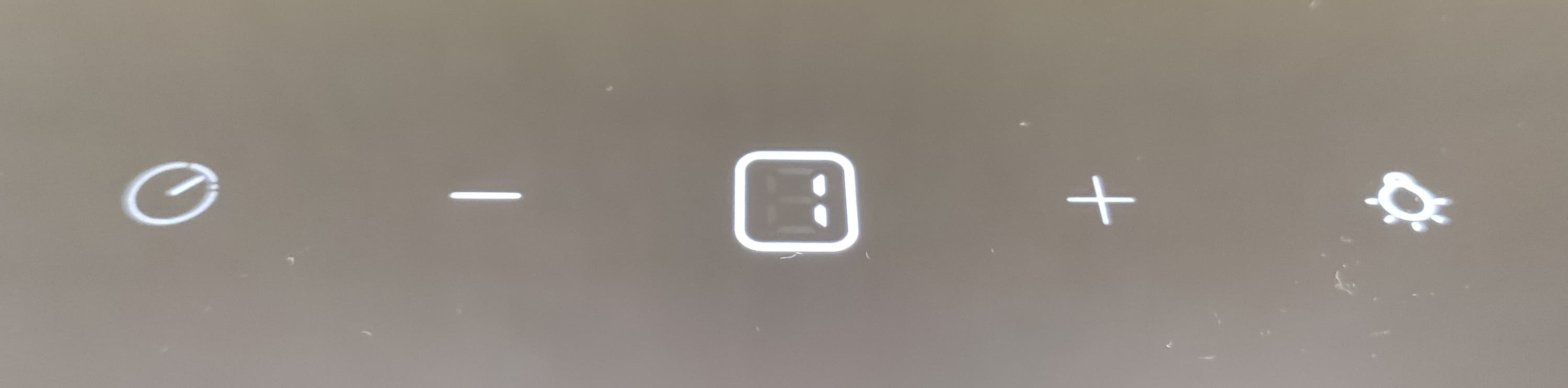 После пробуждения вытяжки при нажатии на кнопку «+» отобразится скорость «0». При последующих касаниях скорость будет изменяться циклично: 0-1-2-3-b. Нажатие вместо этого на кнопку «−», соответственно, включит скорость «b» (повышенную мощность), а при последующих касаниях скорость будет изменяться циклично: b-3-2-1-0. После 5 минут работы на скорости «b» вытяжка автоматически вернется к скорости 3.