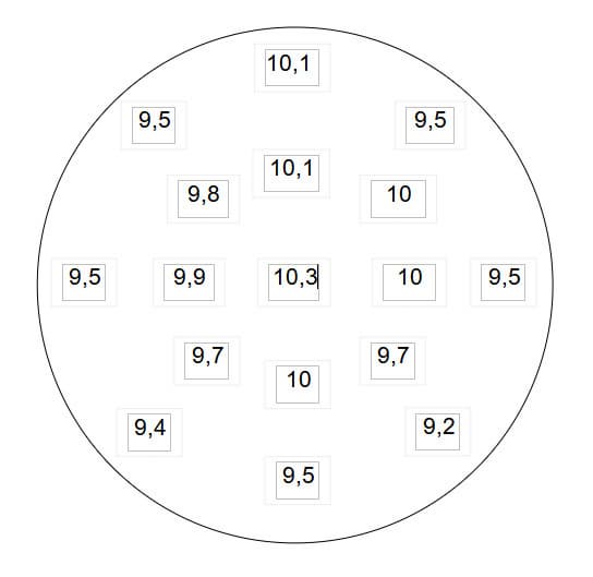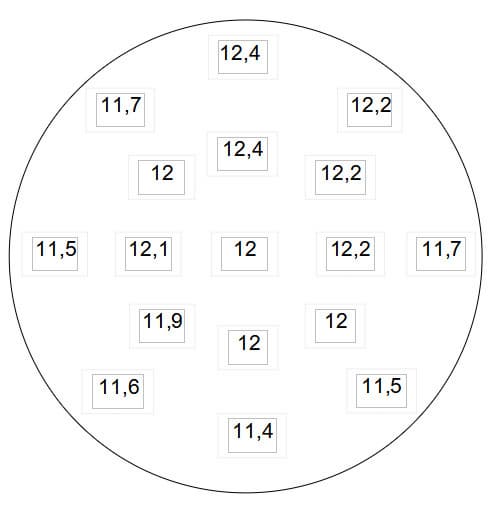 Исходя из полученной средней скорости вычисляется производительность вытяжки в кубометрах воздуха в минуту. Для этой модели результаты измерений выглядели следующим образом (цифры — скорость в метрах в секунду).