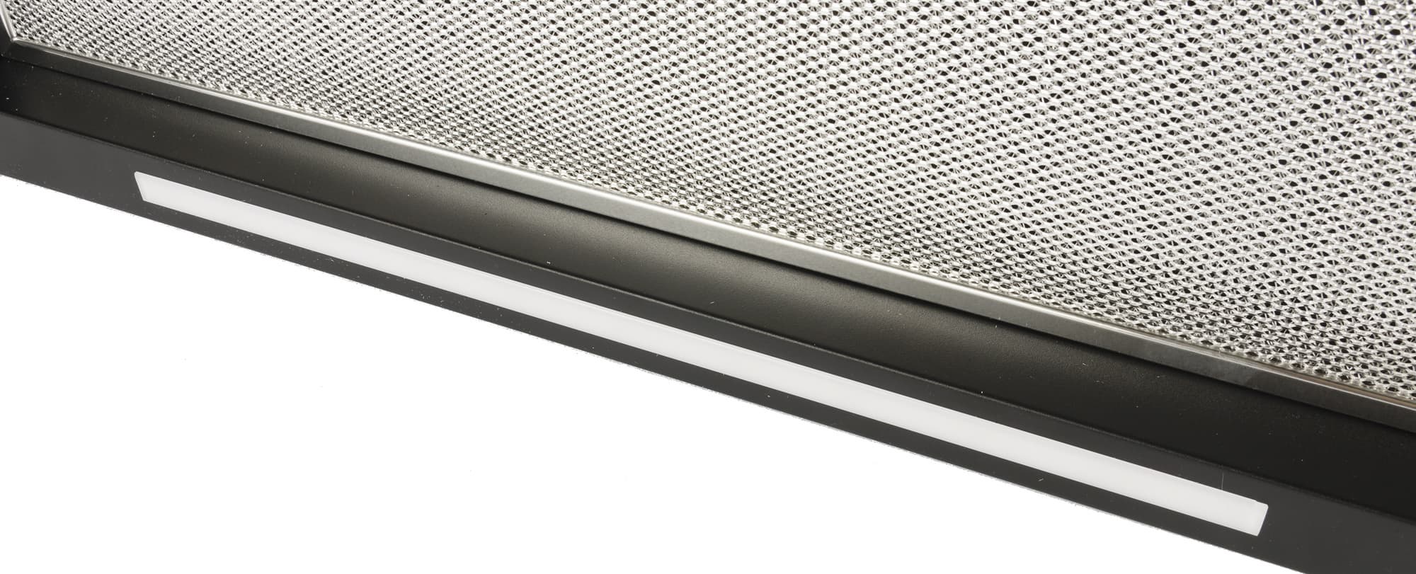 На нижней стороне обращаем внимание на один плафон светодиодной подсветки и алюминиевый антижировой фильтр. Фильтр у нашей вытяжки самый обычный, выполненный в классическом «металлическом» варианте (то есть, без покраски).