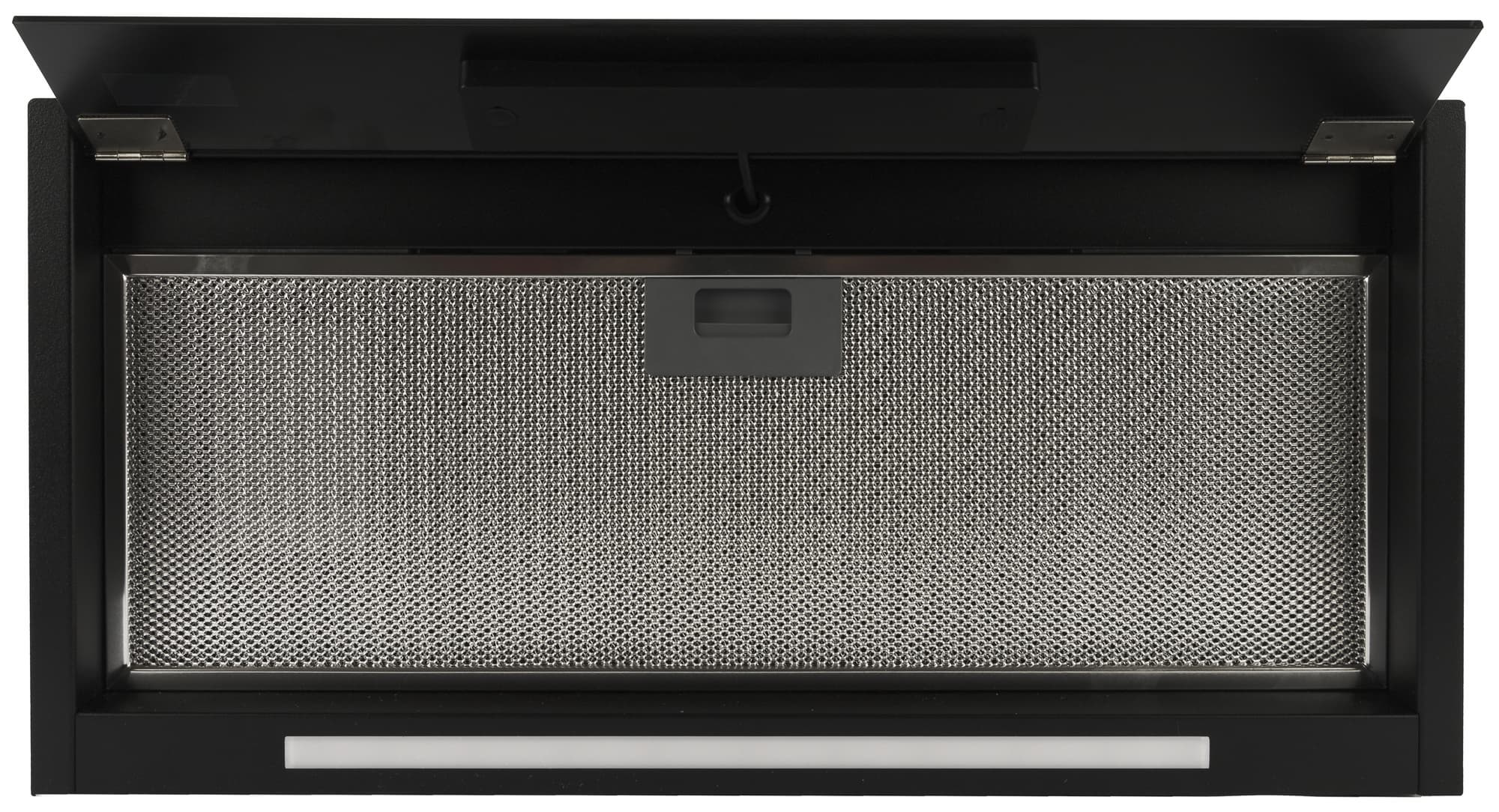Итак, в «сложенном» виде вытяжка занимает минимум места, а если нужно ее включить — просто откидываем козырек и нажимаем на нужные кнопки (они у данной модели сенсорные, со светодиодной подсветкой). Отметим, что откидной козырек выполняет не только декоративную, но и практическую функцию — он защищает кухонные фасады от прямого потока пара, исходящего от кастрюль и сковородок.
