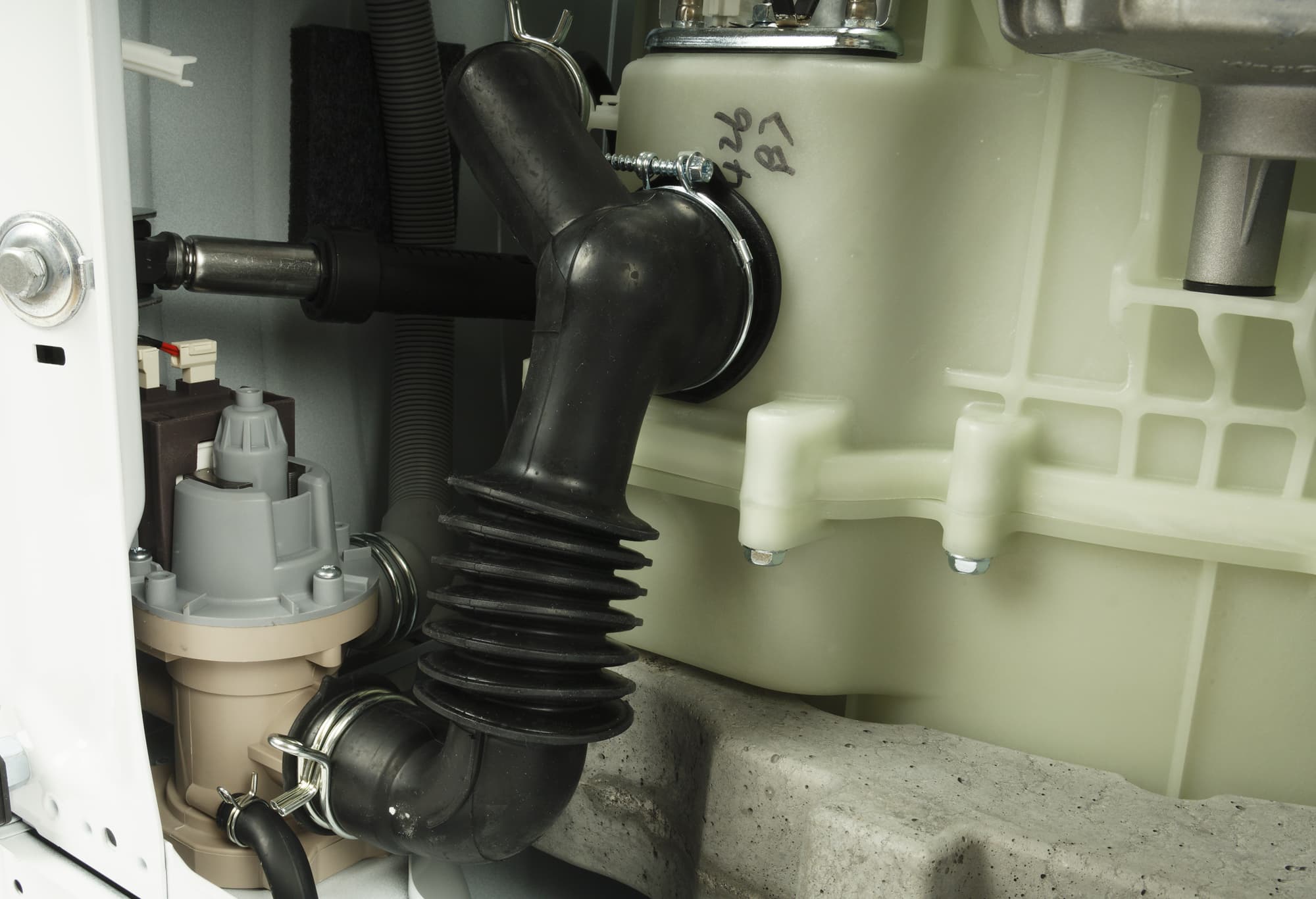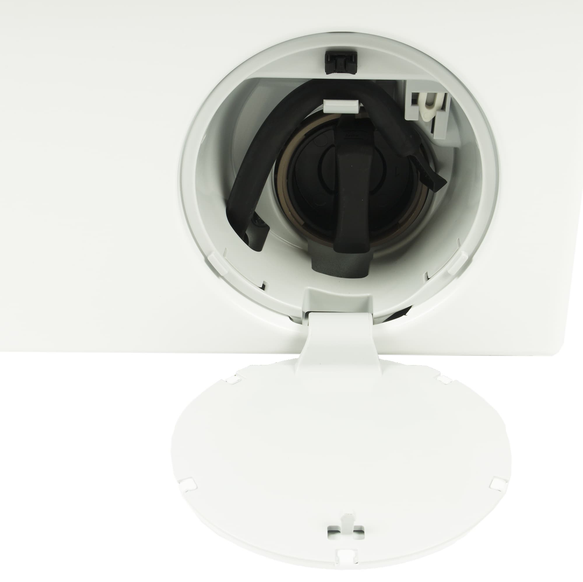 В нижнем правом углу передней панели — круглый лючок, под которым скрывается крышка сливного фильтра и штуцер аварийного слива воды.