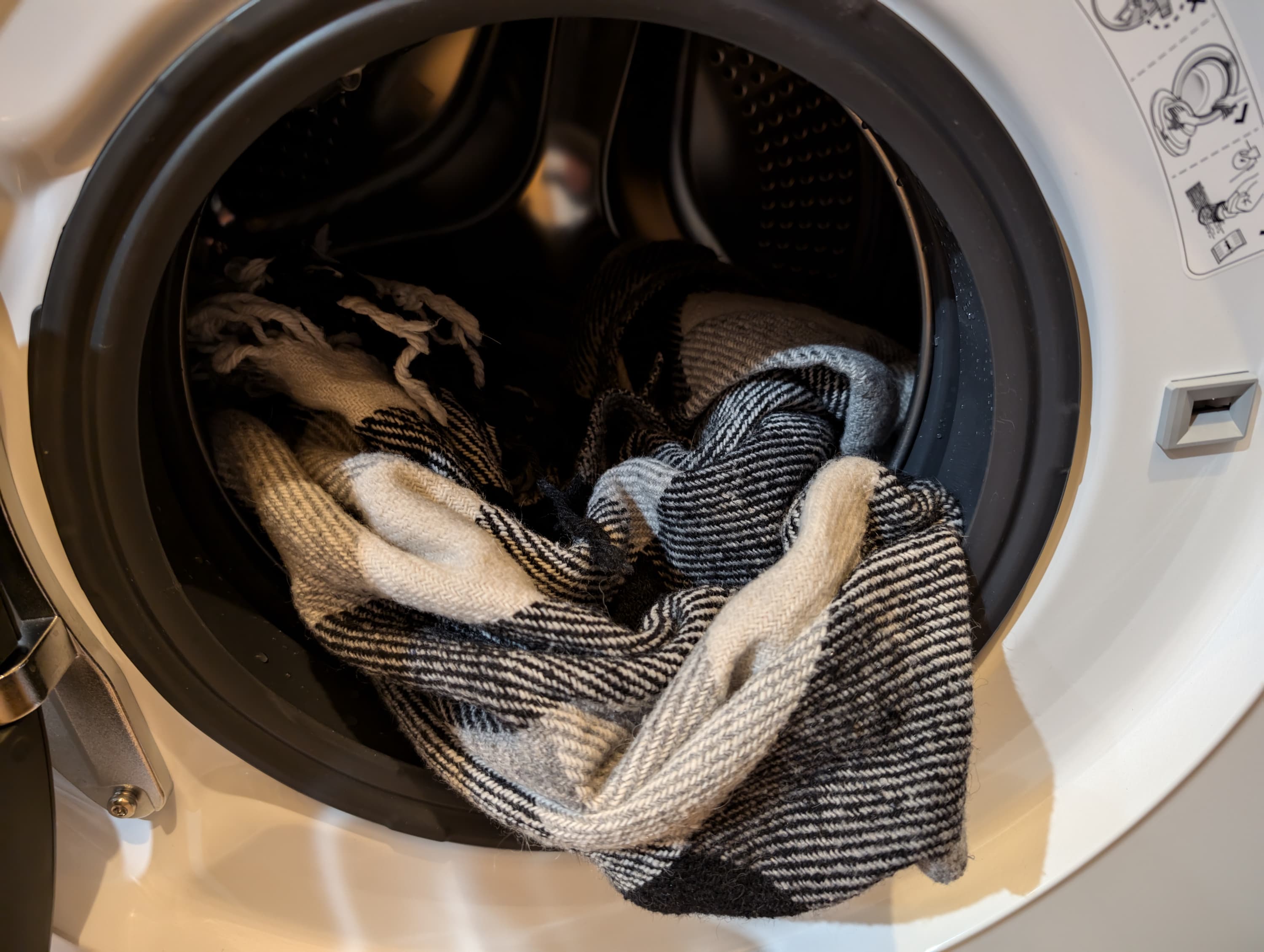 Но в жизни нам приходится стирать не только хлопок, но и более деликатные ткани. Так что еще один наш постоянный тест — стирка шерстяного пледа весом чуть меньше килограмма.