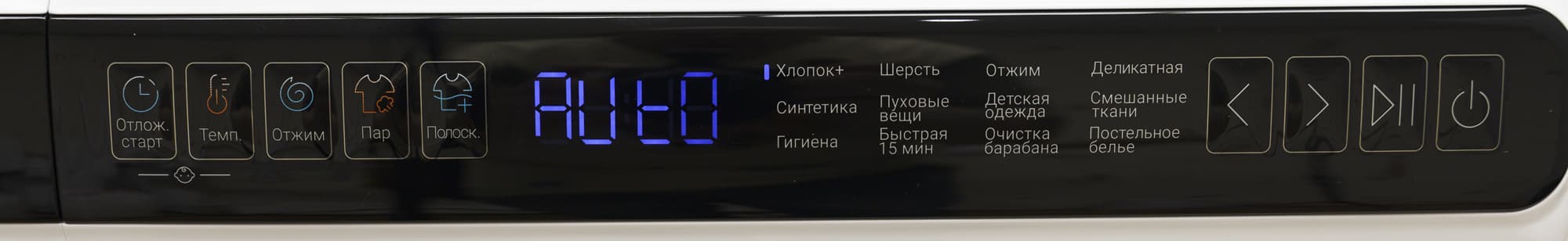 В этой модели отсутствует традиционный селектор программ. Вместо него производитель предлагает воспользоваться стрелочными кнопками в правой части панели управления: рядом с названием выбранного режима загорается светодиод.