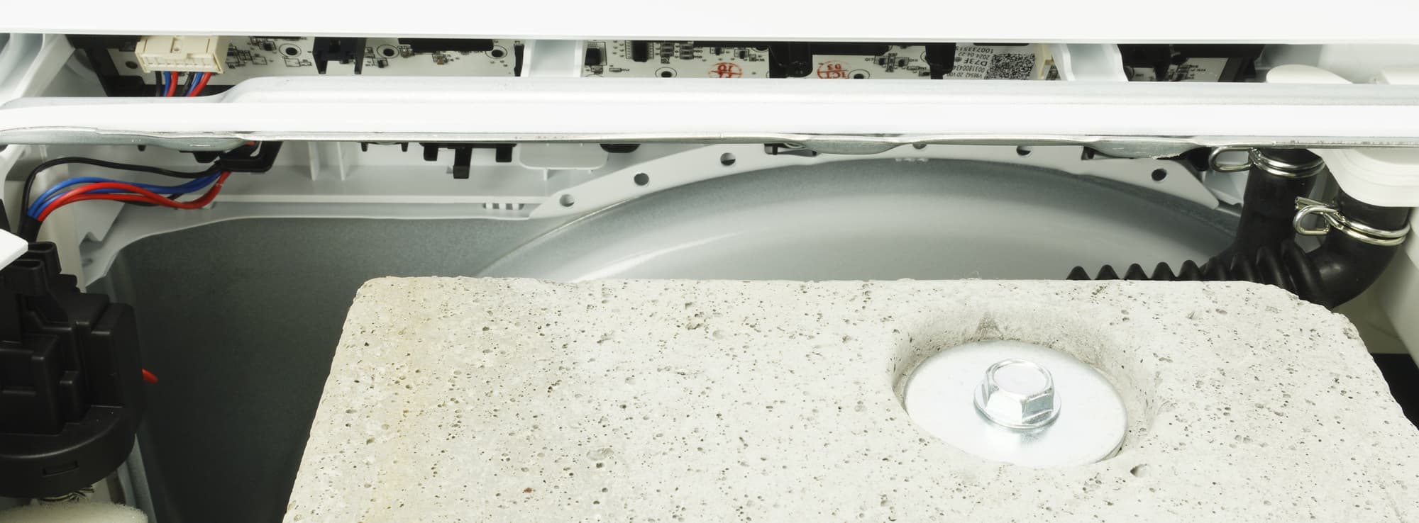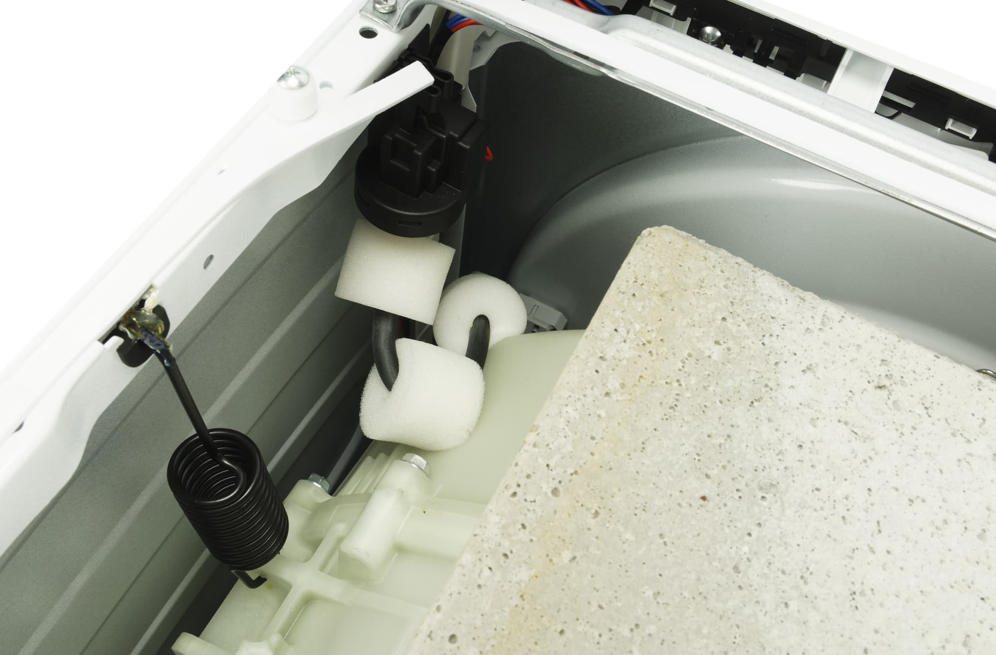 В комплект стиральной машины входят четыре шумоизолирующие прокладки из пористого материала с самоклеящимся основанием. Их рекомендуется установить по периметру нижней стороны корпуса — это поможет снизить шум при стирке и отжиме.