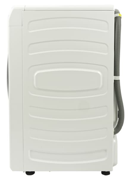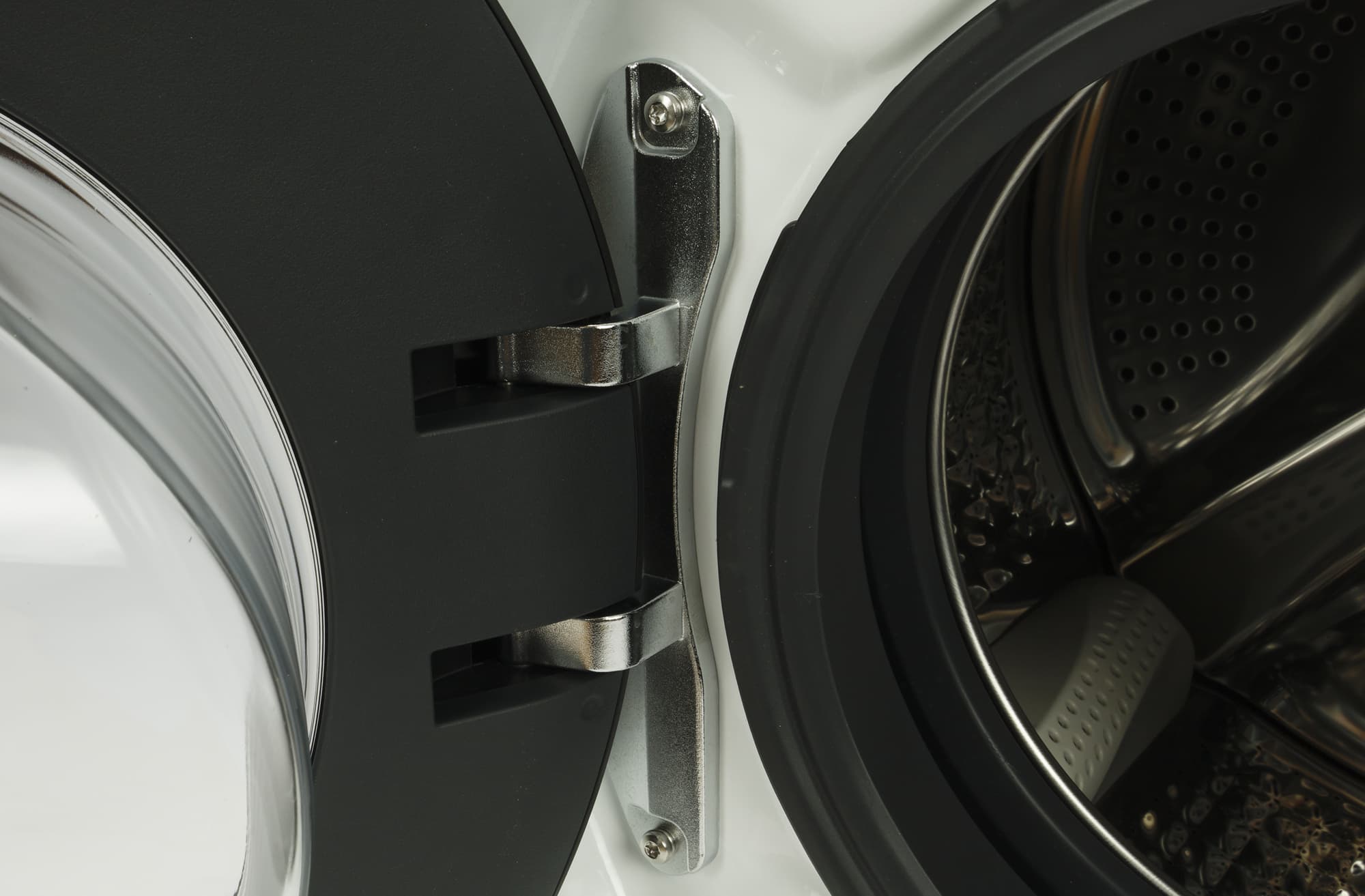 В технических характеристиках этой модели на сайте производителя мы обнаружили опцию «Автоматическое закрытие дверцы», но так и не поняли, как она работает. У люка, насколько мы можем судить, нет никаких дополнительных механизмов. Если запустить стирку, не закрыв его до конца, машина издаст предупреждающий сигнал и выведет сообщение об ошибке на дисплей, но не закрывает дверцу автоматически.