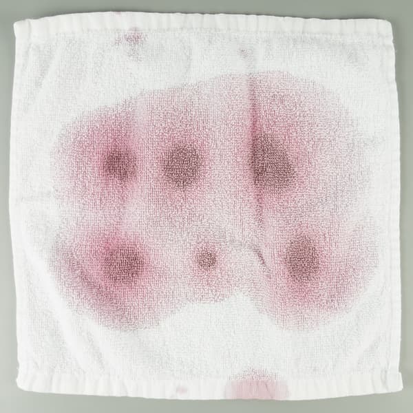 Как обычно, мы взяли красное вино, кетчуп, соевый соус и какао. Эти продукты мы нанесли на белые махровые салфетки из хлопка и выдержали ткань с такими разными «рисунками» в течение суток, чтобы загрязнения высохли и задача стала потруднее.