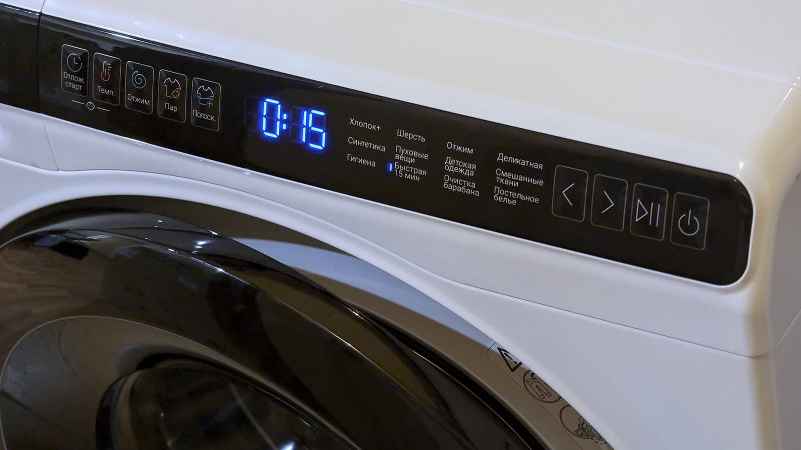 Правее стрелочных кнопок расположены сенсоры «Пуск/Пауза» и «Power». Первая запускает нужный сценарий и позволяет поставить его на паузу, второй включает и выключает стиральную машину.