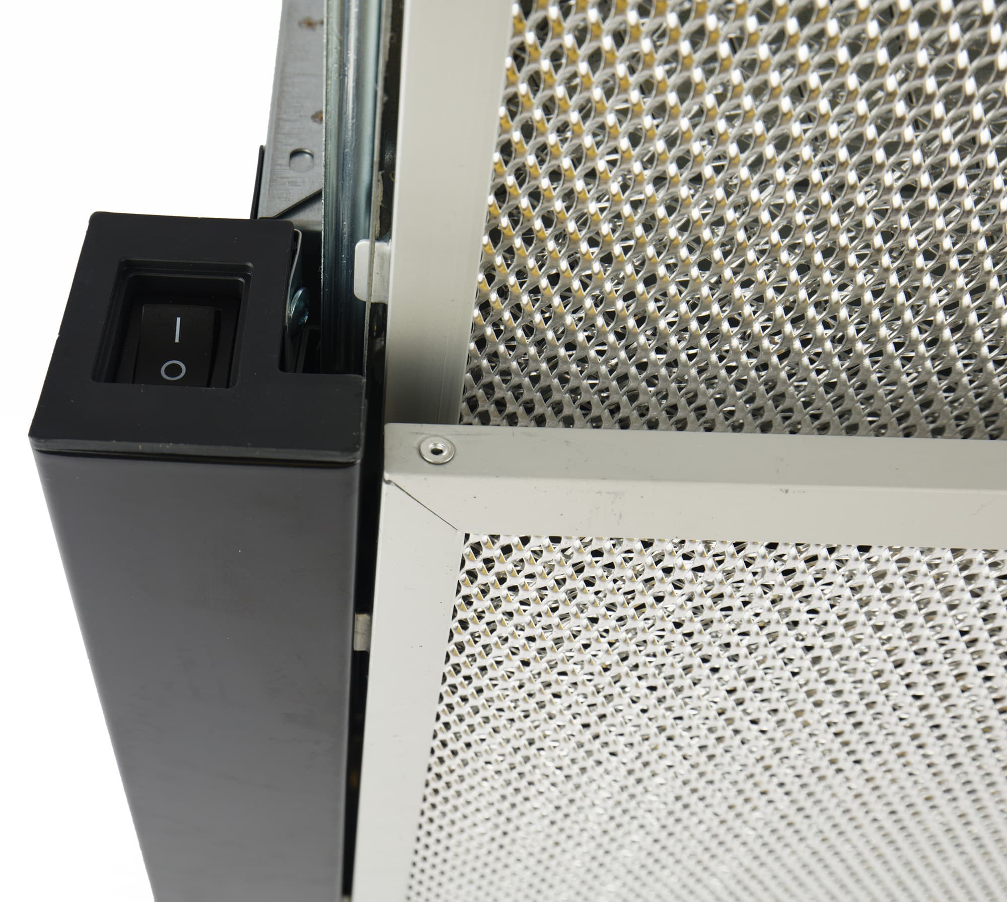 Два одинаковых алюминиевых антижировых фильтра трехслойные, традиционной конструкции: трехмерная металлическая сетка призвана задерживать брызги с плиты, пропуская воздушный поток в вентиляцию. Фильтрующие элементы крепятся с помощью стандартной пластиковой защелки.