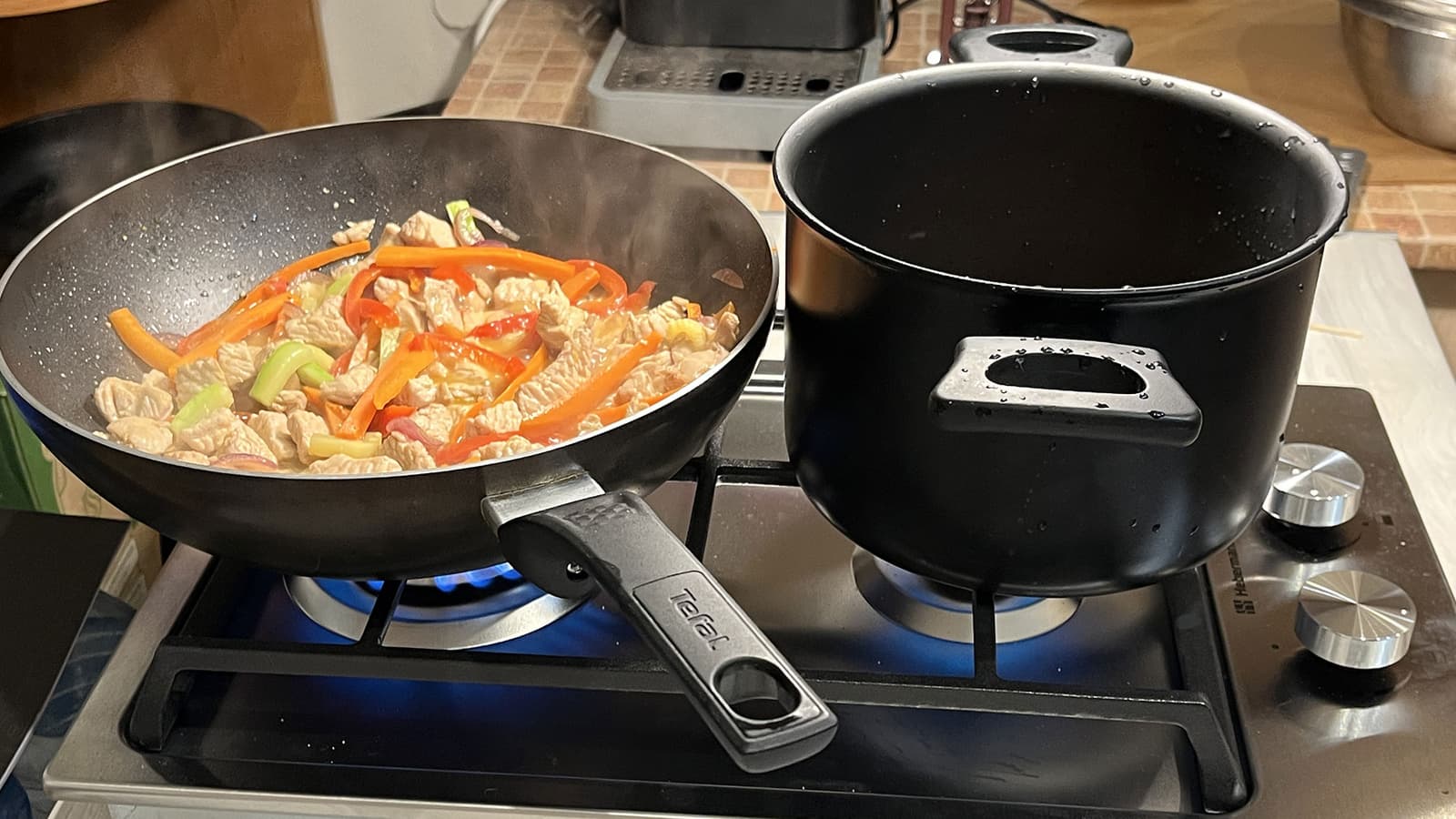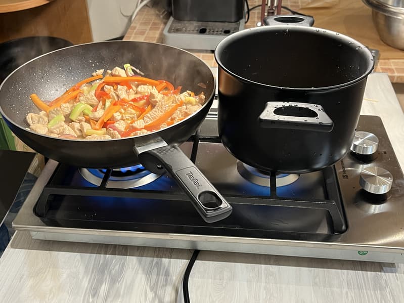 Вот так на плитке разместились кастрюля ∅20 см и вок-сковорода ∅28 см: