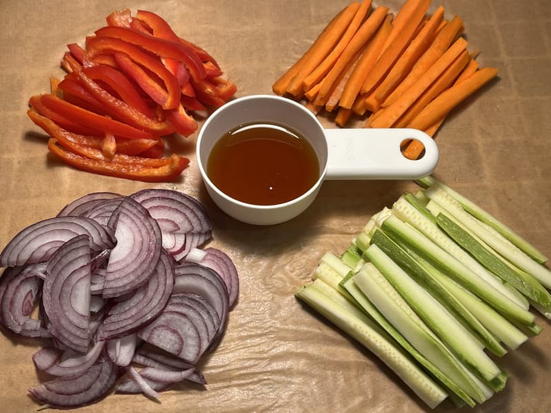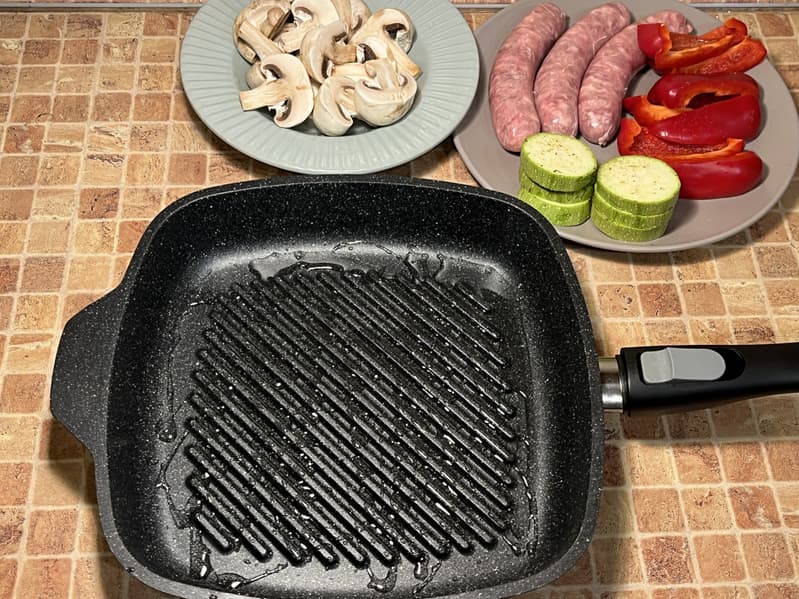Чтобы проверить, справится ли крупная конфорка с большой сковородой нестандартной формы и насколько равномерной получится в таком случае жарка, мы взяли гриль-сковороду и подготовили идеальные для нее продукты. А именно — 3 штуки крупных купат, красный перец, кабачок, натертый травами и солью, и половинки шампиньонов.