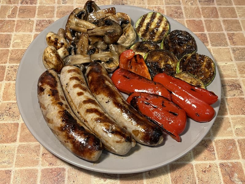 Купаты, шампиньоны и овощи на гриль-сковороде