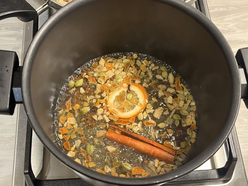 Пряности отправили в кастрюлю вместе с 200 мл воды. Довели до кипения, уменьшили огонь и выдержали специи в кипятке в течение 5 минут.