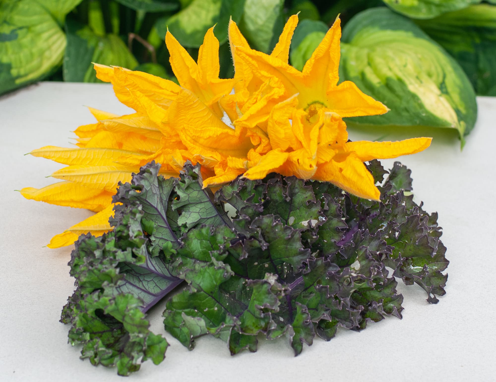 Кейл обмакнули в кляр и тоже обжарили. Цветы подали на листьях кейла.