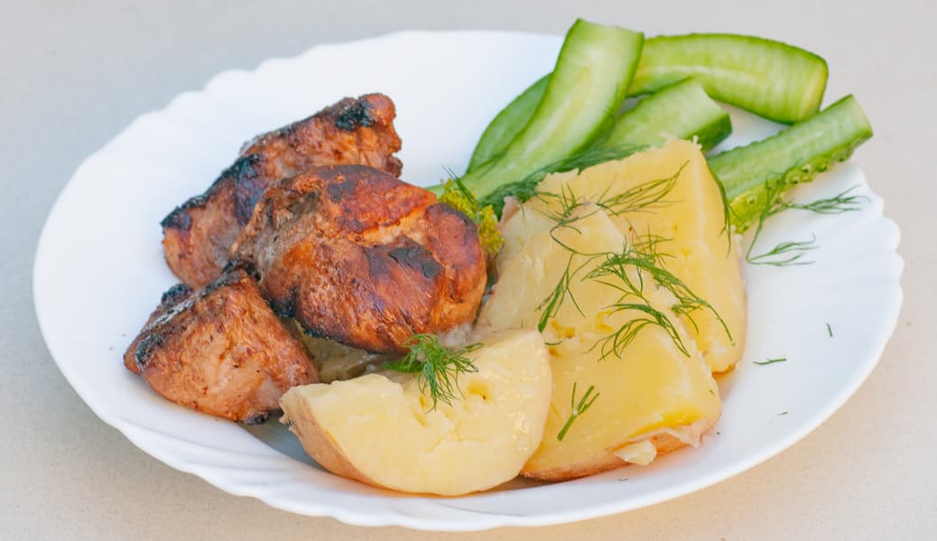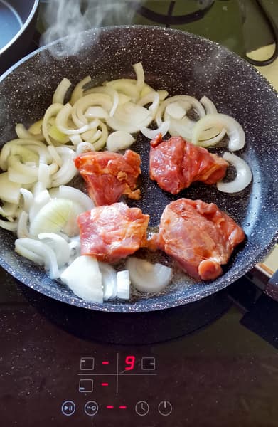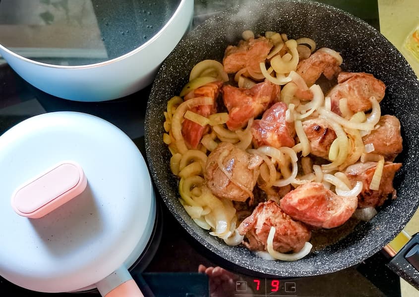 Свинина с луком скорее тушилась, чем обжаривалась — для хорошей обжарки такого количества мяса не хватило уровня нагрева. Если на этой плите делать стейк или вок, требующей высокой температуры, нужно выбирать сковородку большого диаметра с толстым дном и класть меньшие куски, тогда результат будет достигнут. Мы разложили порцию мяса в две сковородки и тогда получили нужный результат.