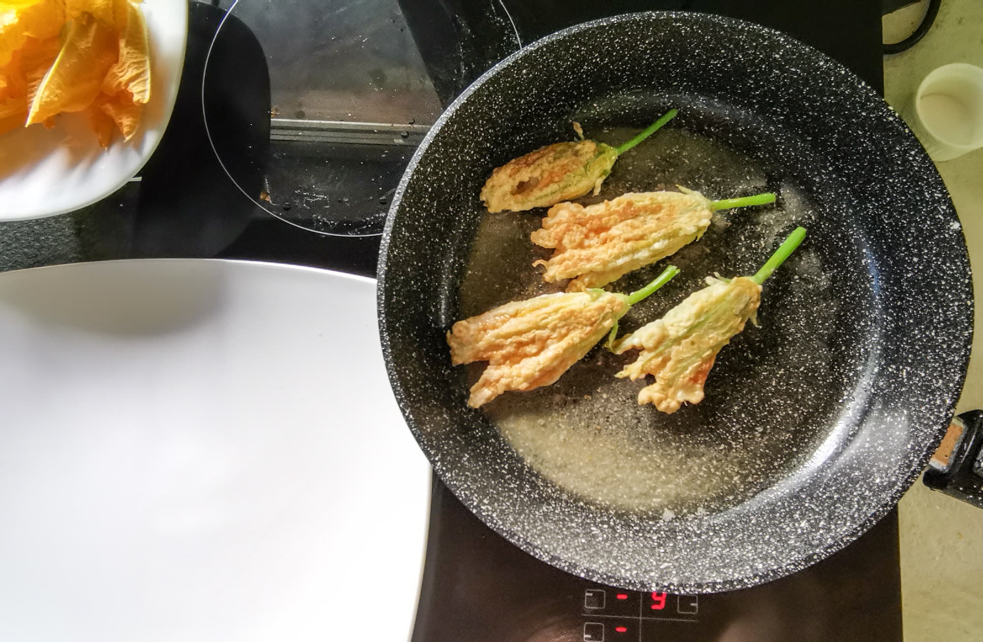 Для того, чтобы цветы не остыли в процессе приготовления, мы поставили керамическую тарелку прямо на варочную поверхность. Получилась тарелка с подогревом.