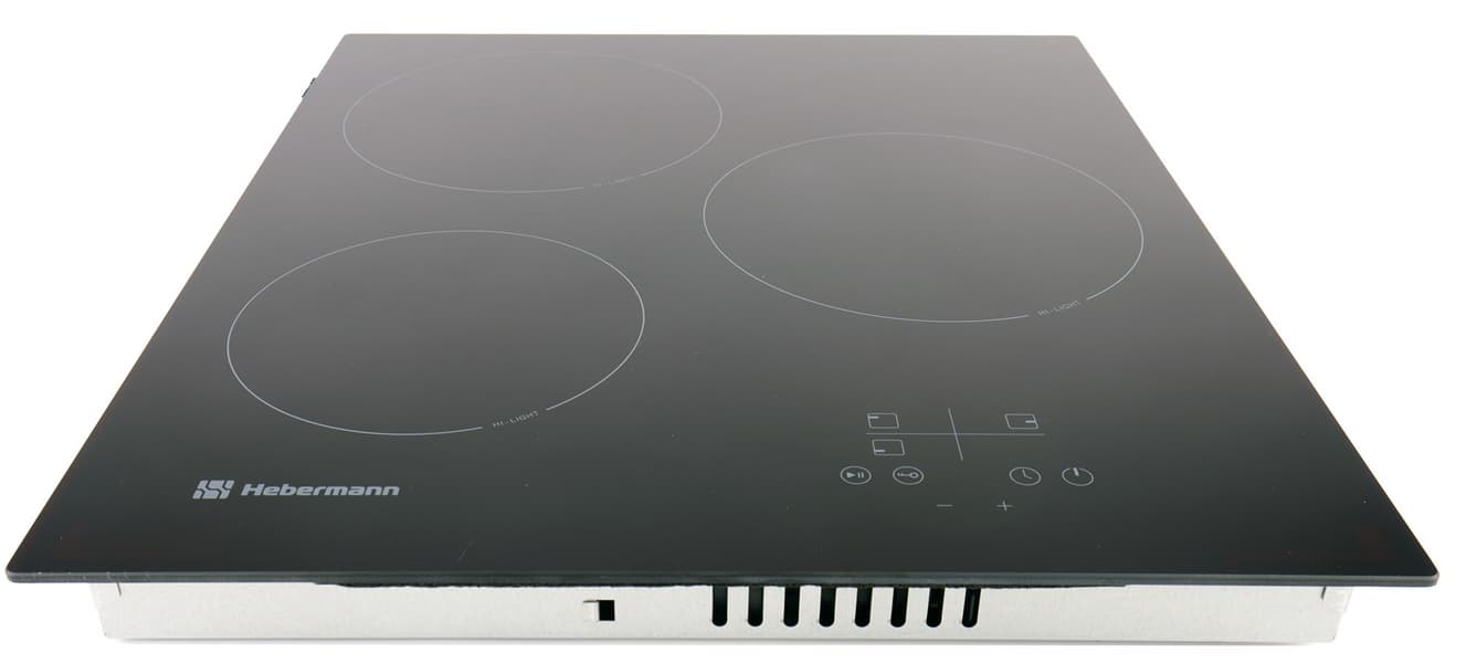 Чаще всего бытовые плиты большие, на 4 конфорки, реже встречаются двухконфорочные, а Hebermann HBKC 4530.1 имеет три рабочие конфорки, 1800, 1800 и 1200 Вт, как некий компромисс между функциональностью и размером. Слева на стеклокерамической поверхности расположена средняя конфорка, за ней — большая, справа — панель управления, а за ней — вторая большая конфорка. Дизайн лаконично-минималистичный, вписывающийся в большинство современных интерьеров.