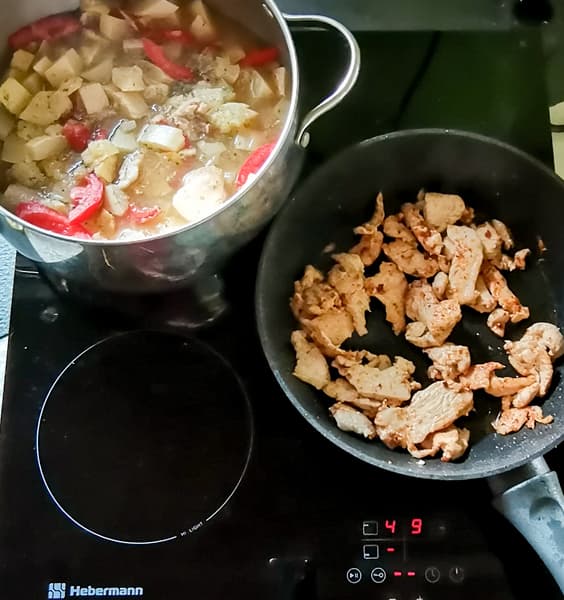 На большую конфорку мы поставили кастрюлю 5 литров с нарезанными кабачками, картофелем, луком, помидорами, маслом и зеленью. Тушили на среднем уровне нагрева под крышкой. В это время на второй большой конфорке при максимальном нагреве на сковородке диаметром 26 см мы обжарили нарезанную куриную грудку. Обжаренную курицу сложили в овощи, тушили до готовности.