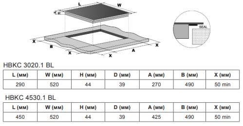 Установка HBKC 4530.1 производится в отверстие рабочей поверхности, размера, указанного в таблице. Толщина столешницы из термостойкого материала должна быть не менее 28 мм. В целях безопасного использования вокруг прибора следует оставлять не менее 5 свободных сантиметров.