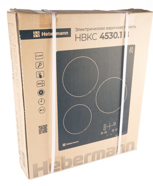 Электрическая варочная поверхность Hebermann HBKC 4530.1 приехала на тесты в коробке из толстого технического картона. На коробке монохромная печать — фотография прибора, его технические характеристики и служебные пиктограммы. Снаружи коробка дополнительно затянута полипропиленовой лентой, ручек и прорезей конструкцией не предусмотрено, а внутри поверхность надежно зафиксирована пенопластовыми вставками.