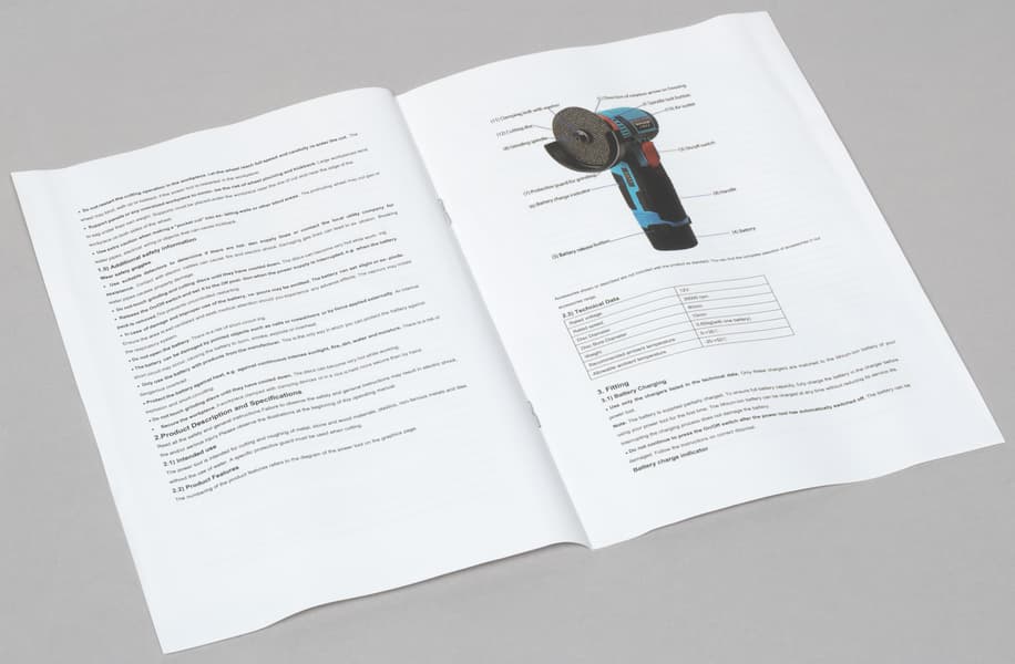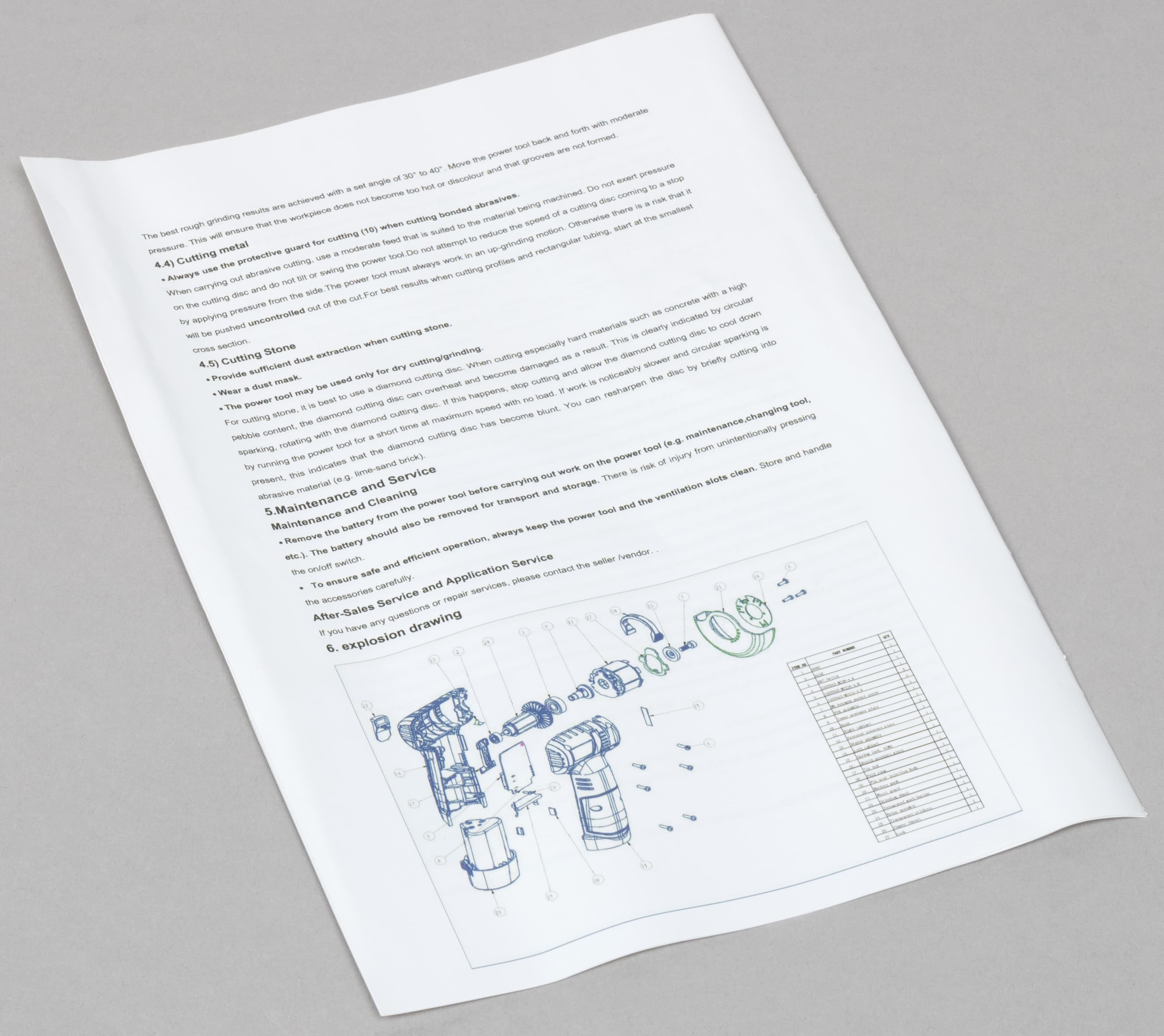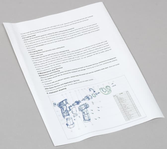 В комплекте к УШМ имеется англоязычная инструкция с перечислением мер безопасности при работе и методов выполнения тех или иных задач. Имеется даже схема полной разборки инструмента. Но схема напечатана так мелко, что толку от нее нет никакого.