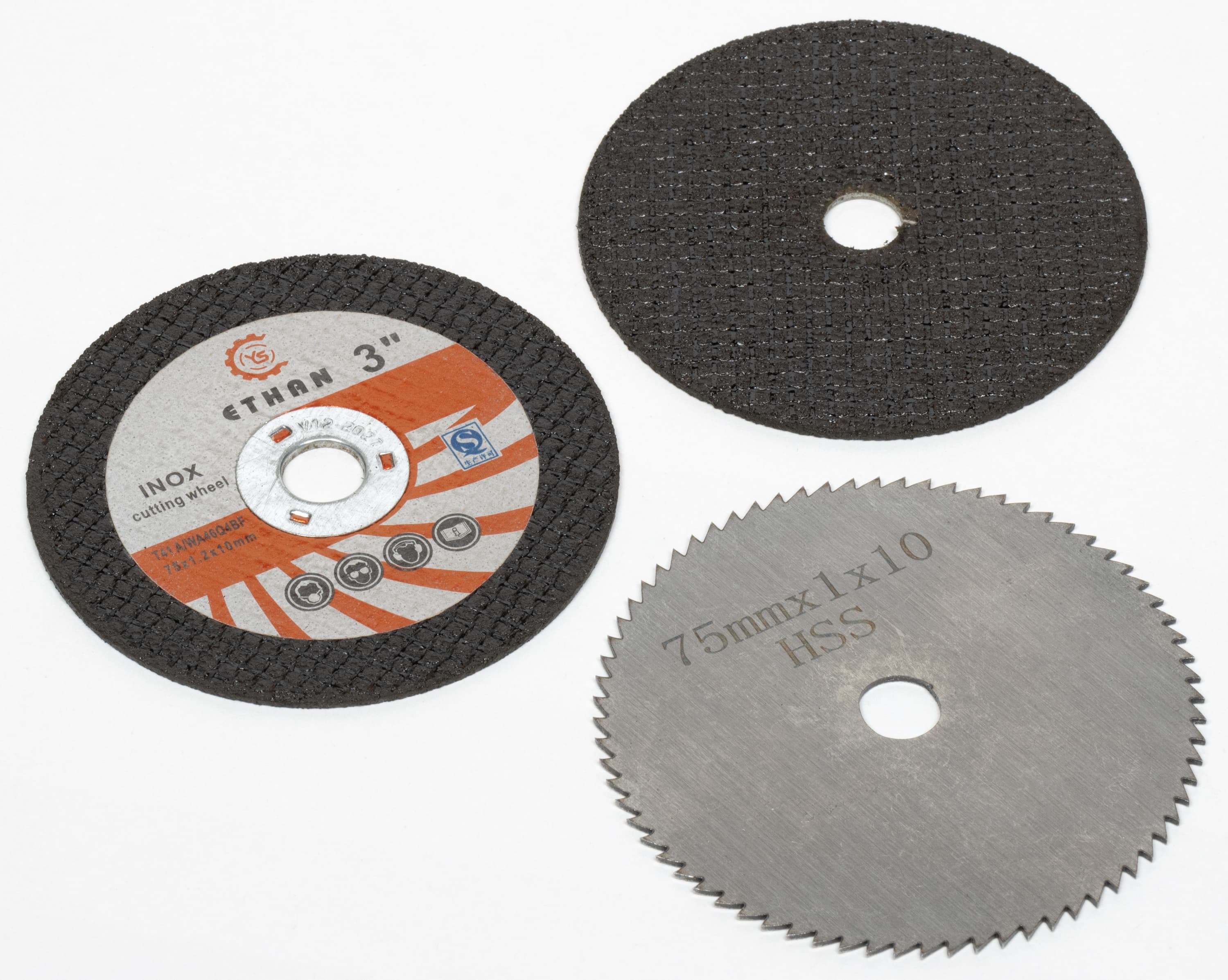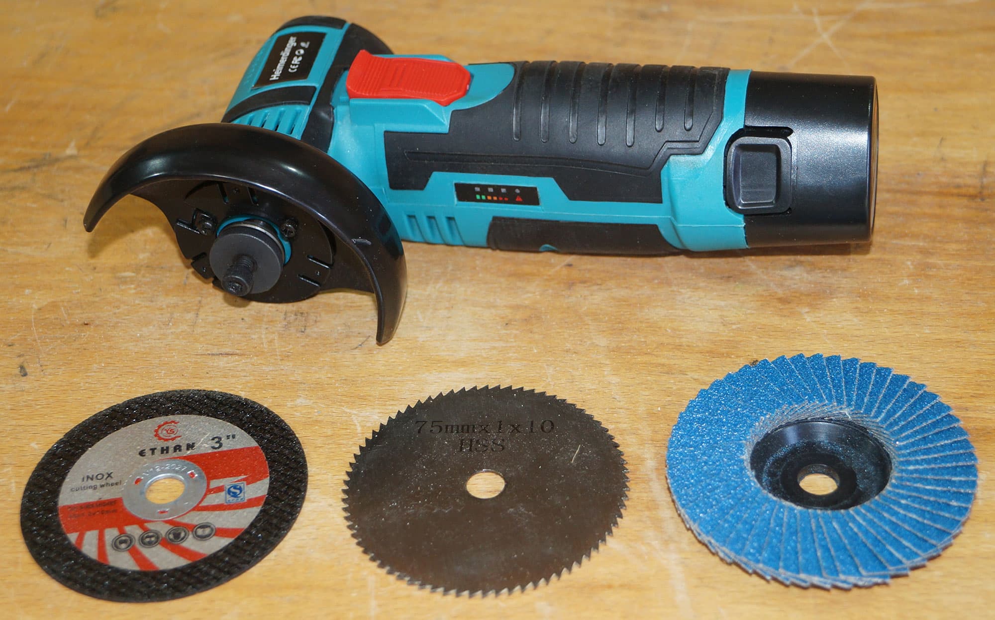 Неудивительно, что мы оказались не готовы к тестированию подобного инструмента в плане оснащения всякими-разными насадками. Откуда им взяться в хозяйстве? Вот стандартной 125-миллиметровой оснастки — вагон и тележка. А таких 75-миллиметровых — только те, что были в комплекте: два отрезных диска по металлу/пластику и один по дереву.