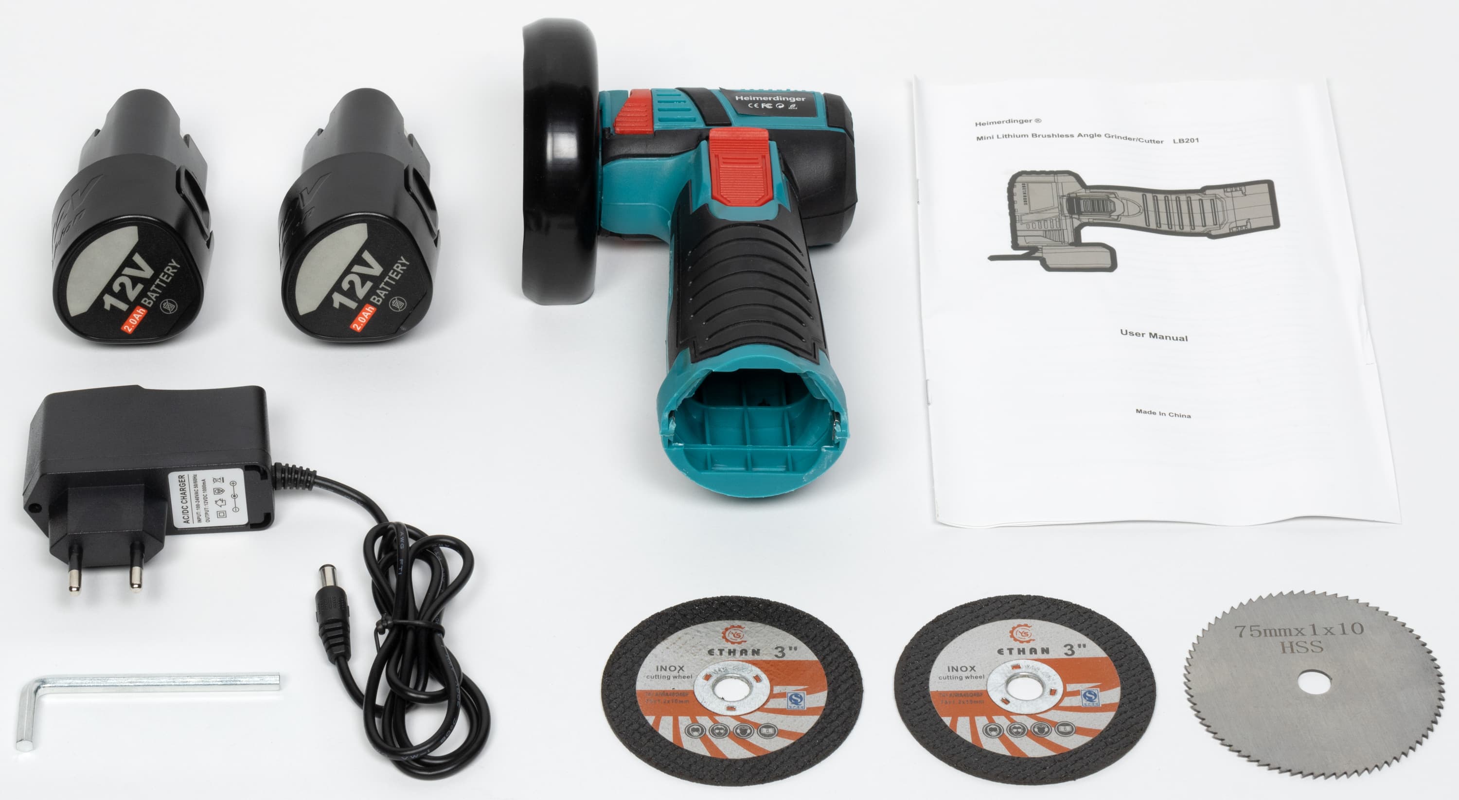 В комплекте с УШМ имеется установленный защитный кожух, ключ, два аккумулятора с зарядным устройством, два диска для резки металла и один для дерева, а также печатная продукция. Жаль, что в комплекте нет хотя бы одного шлифовального диска. Придется докупить, хотя бы в целях тестирования инструмента.