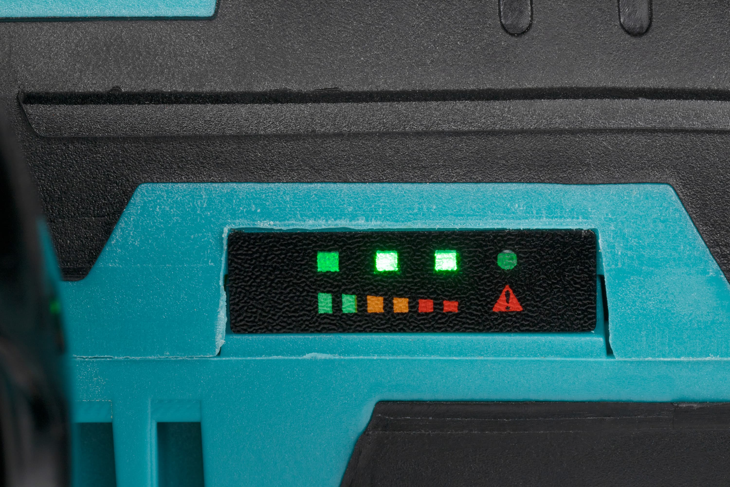 Но такая индикация имеется на самом инструменте. Небольшая панелька содержит четыре светодиода, три из них указывают на текущий заряд, а четвертая лампочка сигнализирует о разряде батареи и/или об ошибке (отключение двигателя вследствие перегрузки или перегрева). Отметим неудачную конструкцию этого сигнального блока. По всей видимости, расположенные там светодиоды не разделены между собой глухими перегородками, и свечение одного светодиода отлично передается на все «окошечки». Из-за этого очень трудно понять, сколько в данный момент светодиодов работает. На следующем снимке видны два работающих светодиода, но это лишь благодаря умению редакционного фотографа, который выставил правильный «треугольник экспозиции».