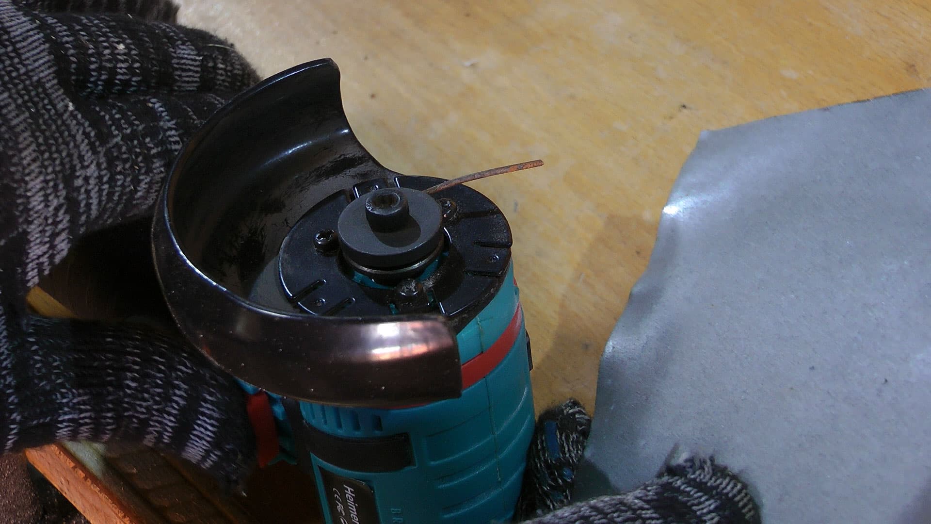Для того, чтобы отвернуть болт, нужно заблокировать вал. В обычных УШМ такая блокировка осуществляется нажатием и удержанием специальной кнопки. Здесь же вместо кнопки используется странная приспособа, напоминающая подкову. Чтобы заблокировать вал, требуется поднять ее вверх. Сделать это можно только двумя пальцами. Неудобно.