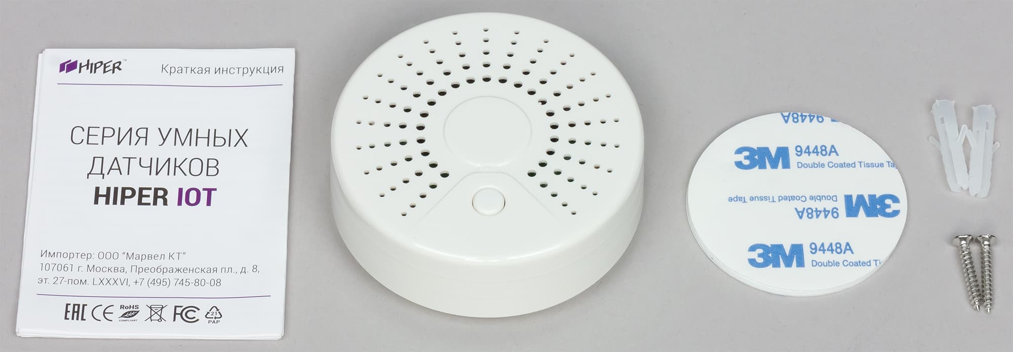 Датчик дыма поставляется в комплекте с инструкцией и набором для крепления.