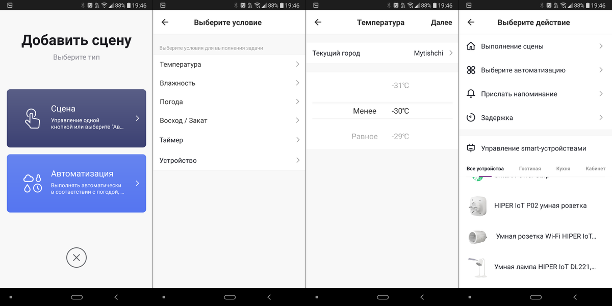 Процесс подключения датчиков практически идентичен подключению других устройств. Кстати, надо отметить, что различных приборов в этом меню крайне много — видно, что планы по развитию этого направления у Hiper серьезные. Далее активируем режим сопряжения и по желанию добавляем датчик в одну из комнат.