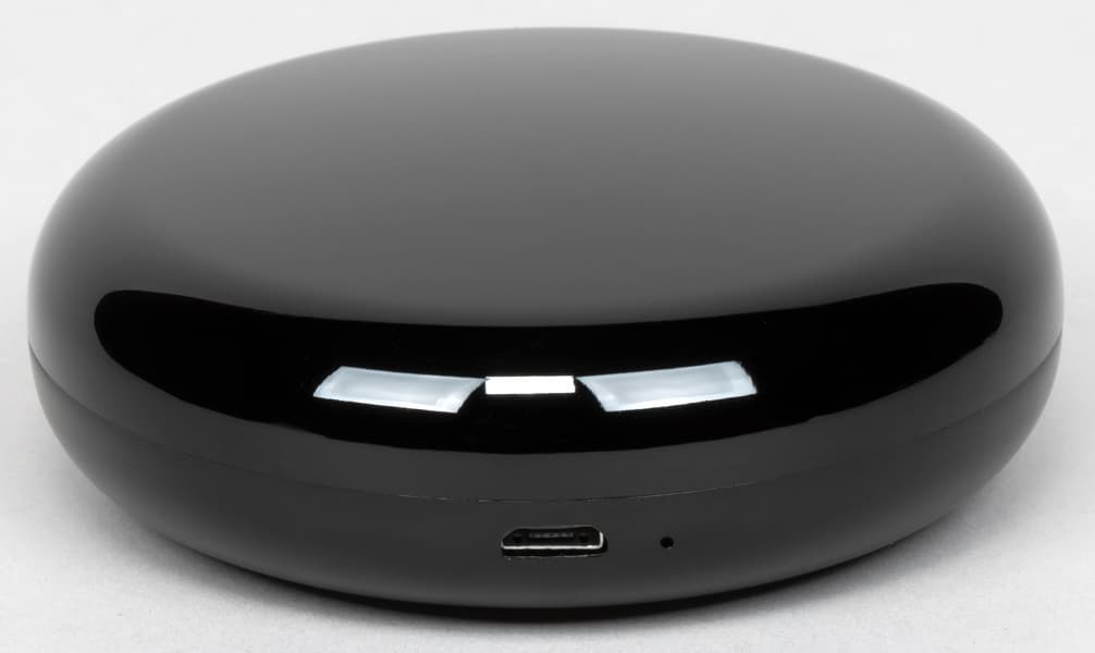 Глянцевый пухлый блинчик имеет разъем Micro-USB, по которому получает питание для работы. Рядом с разъемом находится светодиодная точка-индикатор, показывающая состояние гаджета.