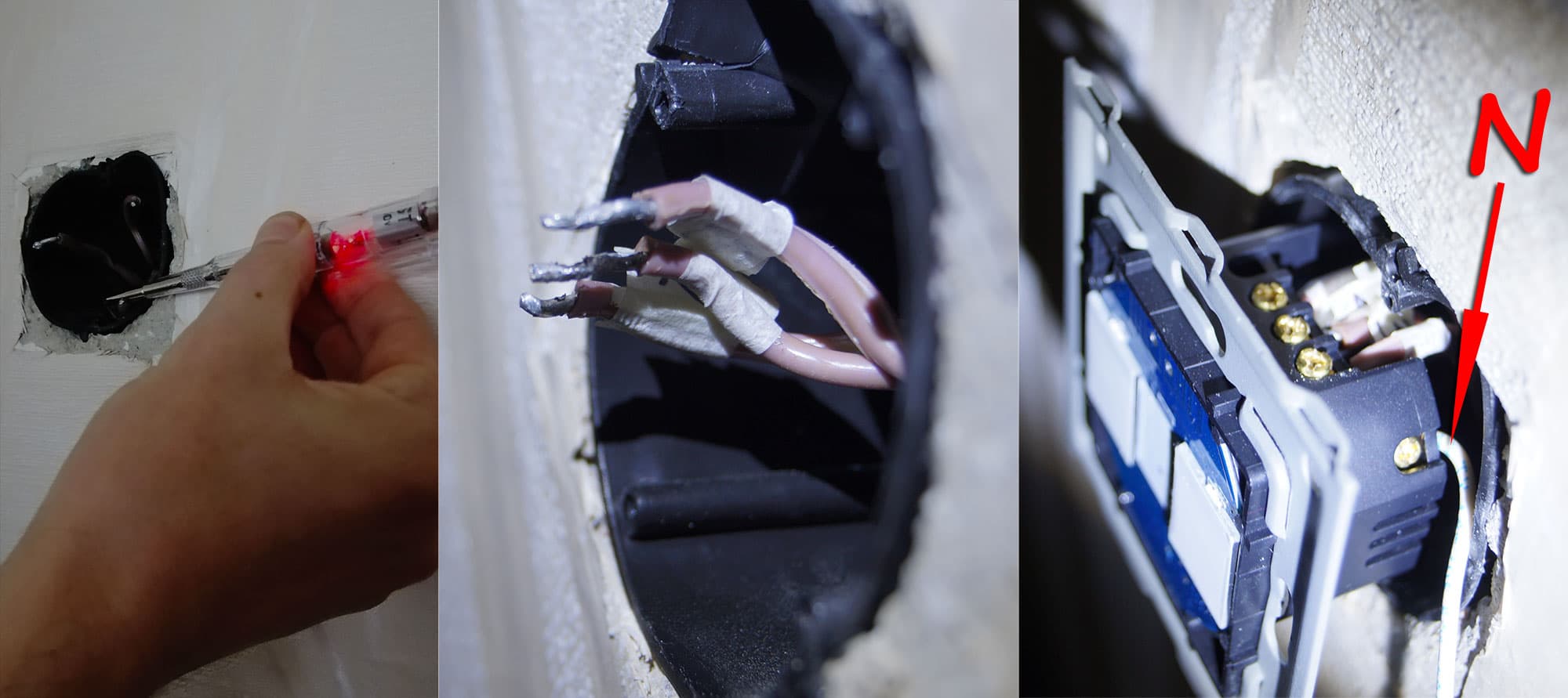 Во-первых, ни один купленный подрозетник никак не желал втискиваться в криво сформованное углубление, которое к тому же еще и уходит внутрь стены не под прямым углом, а наискосок. Все прежние выключатели крепились по старинке, двумя винтовыми распорками — проблем не было. Но наш выключатель требует наличия подрозетника, по-иному его не вмонтируешь. Разносить вхлам свежеотремонтированную железобетонную стену перфоратором почему-то не хочется. С большим трудом, с помощью зубила и молотка, подрозетник все же был втиснут в посадочное место, хоть и принял забавную форму. Однако самое трудное оказалось впереди. В далеких 80-х годах прошлого века электромонтажники не предполагали, что выключателю, кроме фазного провода, может понадобиться еще и нулевой. Поэтому делали просто: в подрозеточное пространство входил фазный провод, остальные жилы (в нашем случае две, поскольку люстра двухрежимная) тянулись к люстре, внутри стены, уходя в потолок. При этом нулевой провод прокладывался к люстре прямо из раздаточного короба, углубления в стене под самым потолком. Добраться до короба теперь почти невозможно: припотолочное пространство давно перекрыто натяжными потолками. Пришлось поступить некрасиво: кинуть ноль от ближайшей розетки. Тонким проводом, потребление-то здесь смехотворное.
