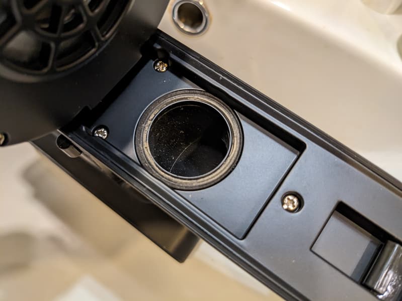 «Стакан» мусоросборника выполнен из темно-серого полупрозрачного пластика. В нем стоит несложный циклонный элемент, внутри которого — HEPA-фильтр в форме усеченного конуса, отвечающий за тонкую очистку.