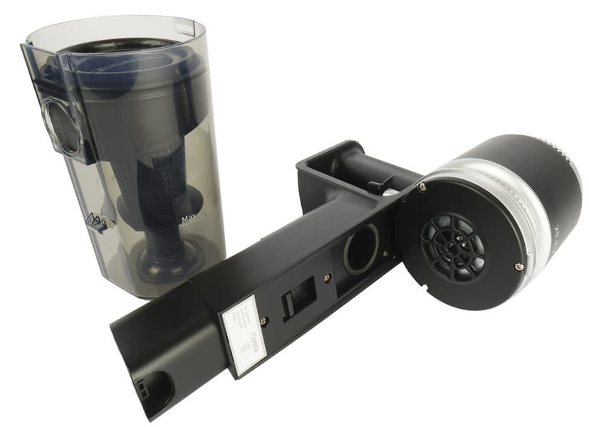 Корпус пылесоса оформлен в строгой черно-серебристой гамме. Компоновка моторного блока продольная: двигатель и циклонный фильтр находятся на одной оси, параллельно воздушному тракту.