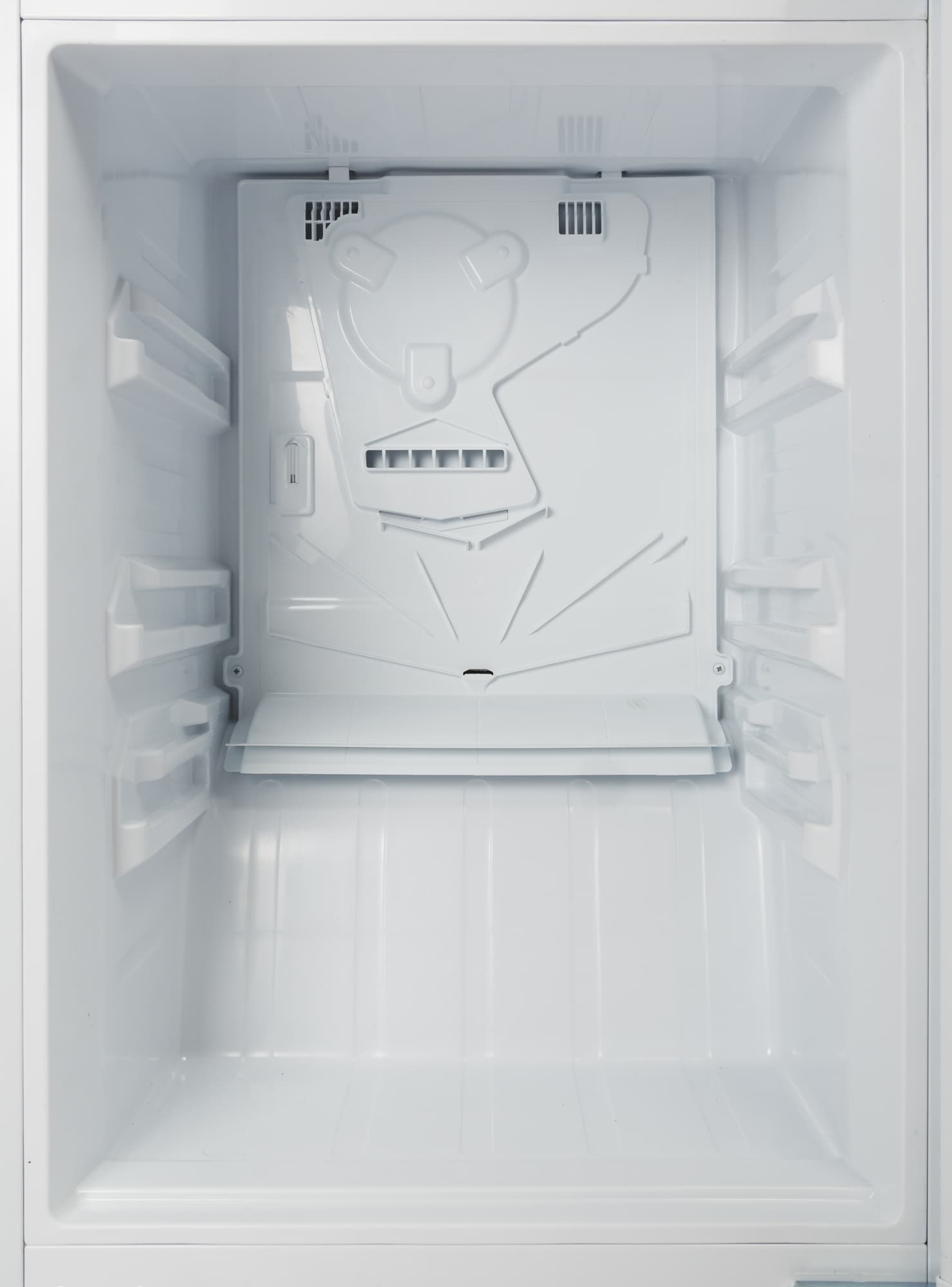 У холодильника классическая двухкамерная компоновка: верхнюю часть занимает холодильная камера, морозилка — снизу.